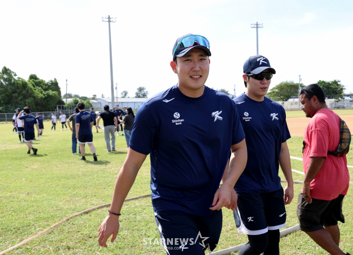 *此内容由AI翻译生成。11月10日,在塞班岛olleye sports complex举行的转地训练第一天,韩国棒球代表队的元泰仁(音)和孙周永(音)正在为热身训练而移动。 2026.01.10.© STARNEWS. 未经许可禁止转载或再分发*此内容由AI翻译生成。