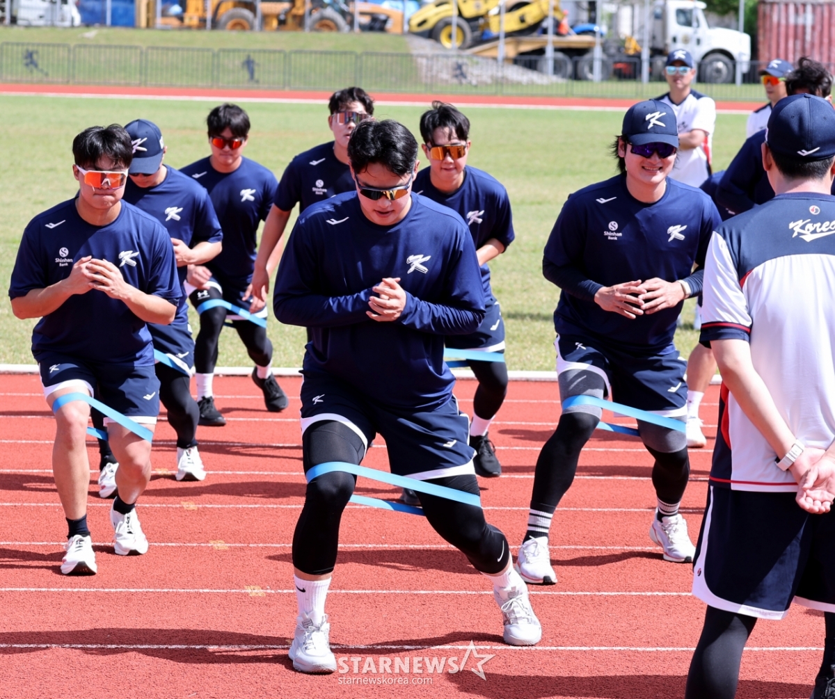 *此内容由AI翻译生成。11日,棒球代表队的文东柱和投手们在塞班岛Olleye Sports Complex举行的转地训练第二天,正戴着乐队进行下肢锻炼训练。 2026.01.11.© STARNEWS. 未经许可禁止转载或再分发*此内容由AI翻译生成。