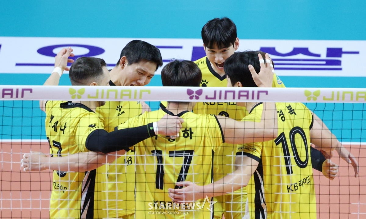 *此内容由AI翻译生成。11日,在首尔奖忠体育馆举行了2025-2026 V-联赛男子组友利信用卡对KB损害保险的比赛。图为KB林成镇在取得决定性进球后与队友们一起庆祝。© STARNEWS. 未经许可禁止转载或再分发*此内容由AI翻译生成。