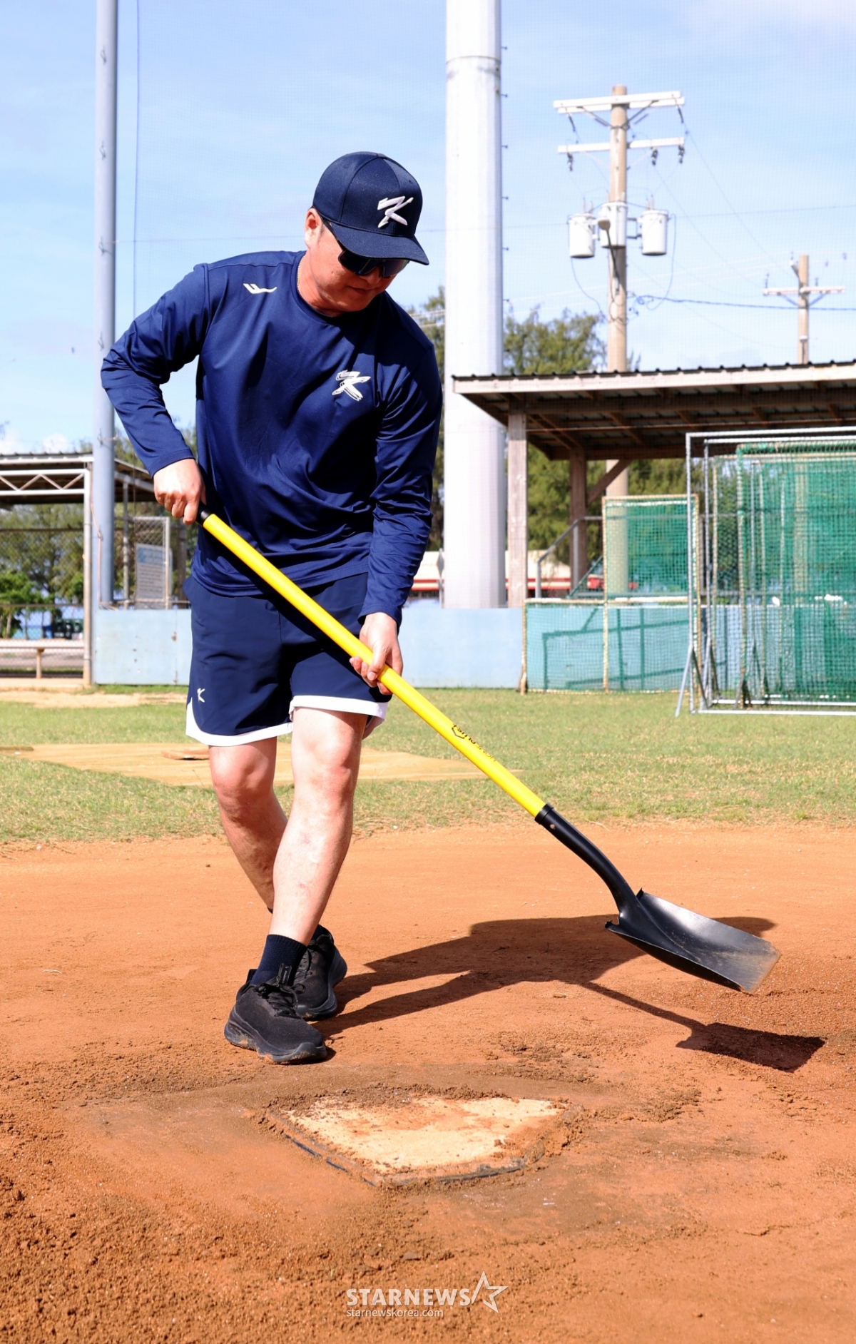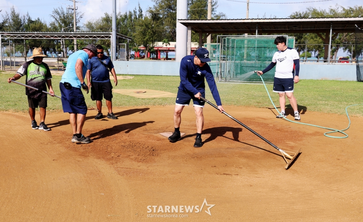 12日,在塞班岛Olleye Sports Complex举行的转地训练之前,棒球代表队的击球教练李振英(音)变身为球场守门员,正在仔细整顿主板周围的球场。 2026.01.11.