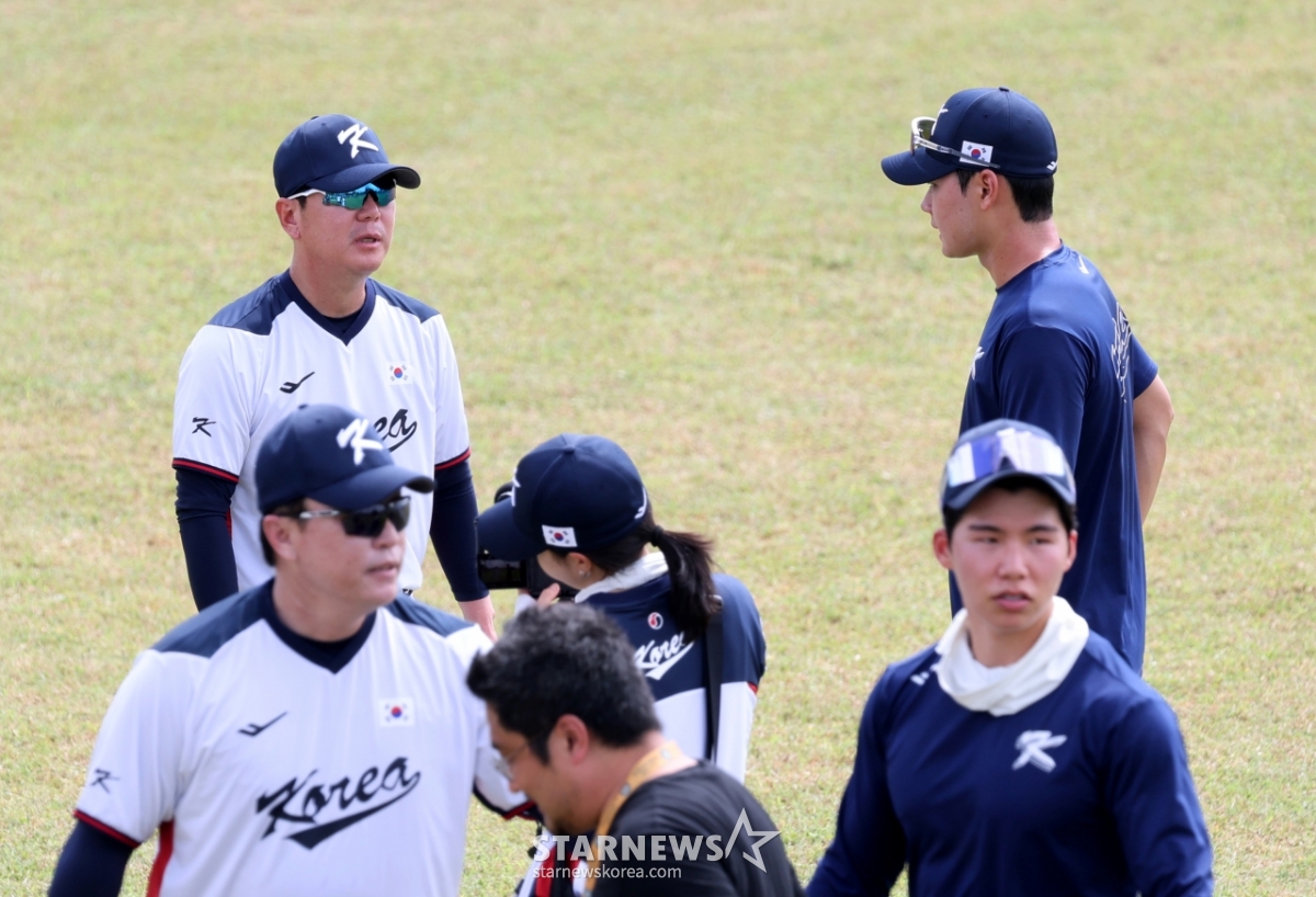 14日,在塞班岛Olleye Sports Complex举行的第5天训练中,韩国棒球队主教练柳智铉正在给结束防守训练的游击手金周元进行一对一的辅导。 2026.01.14