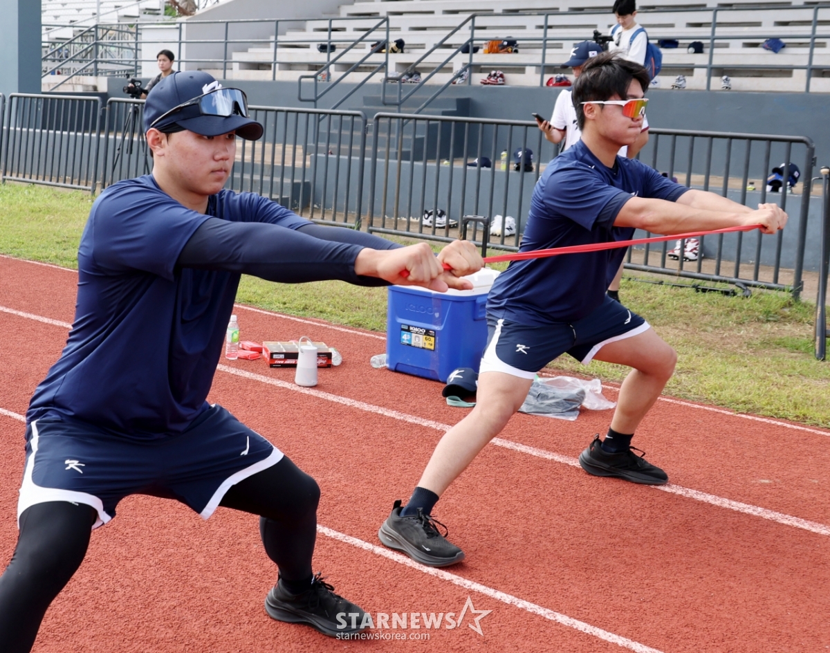 棒球代表队投手赵正宇和裴灿胜14日在塞班岛Olleye Sports Complex举行的第5天训练中正在进行救生训练。 2026.01.14