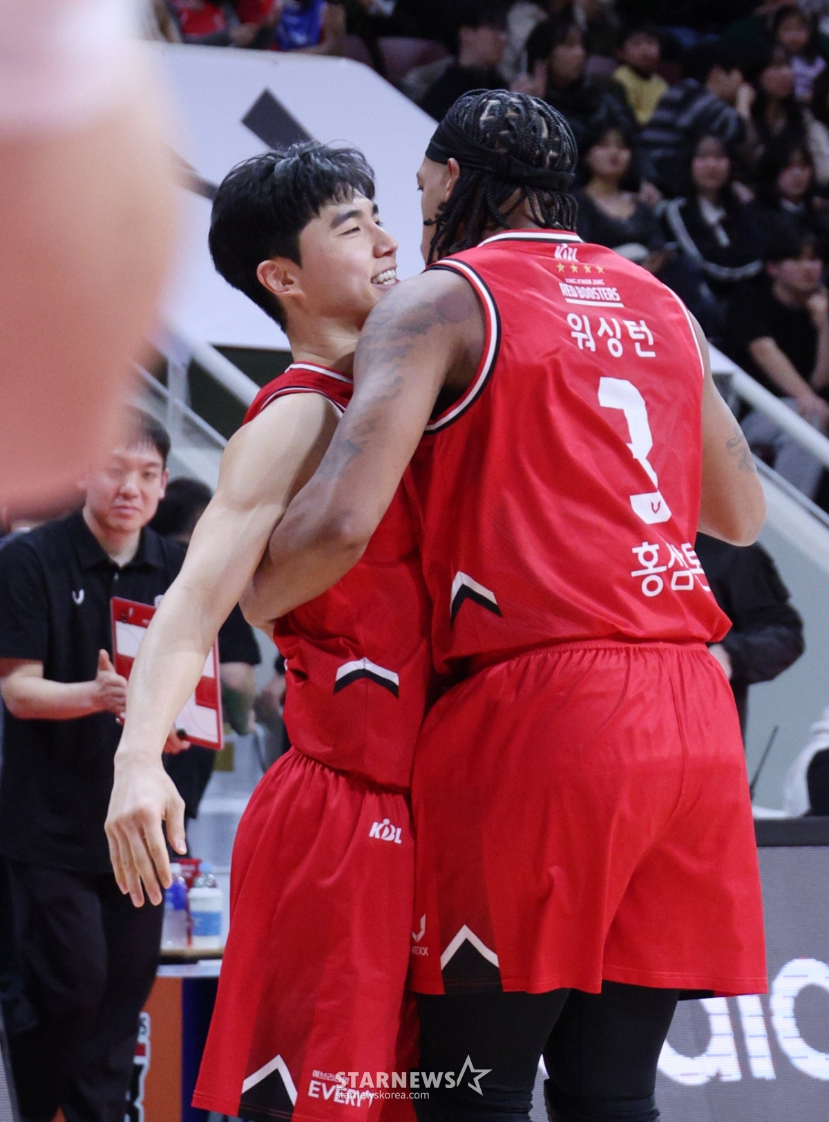 *此内容由AI翻译生成。14日,2025-2026LG电子职业篮球安养正官庄对大邱韩国天然气公社的比赛在京畿道安养正官庄竞技场举行。图为正官庄朴志训正与成功踢进一球的华盛顿队分享喜悦。© STARNEWS. 未经许可禁止转载或再分发*此内容由AI翻译生成。