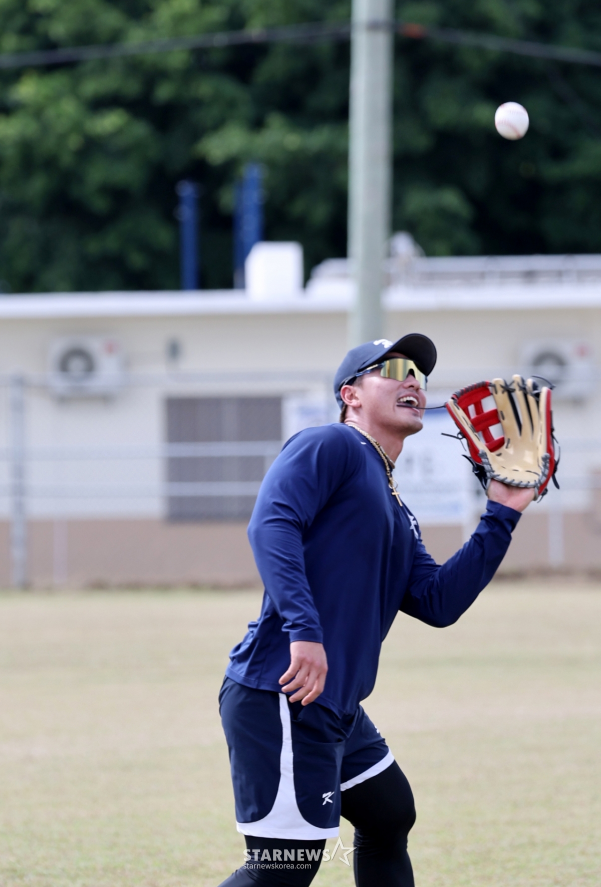 棒球代表队安贤敏14日在塞班岛Olleye Sports Complex举行的第5天训练中,正在捕捉飞球。 2026.01.14
