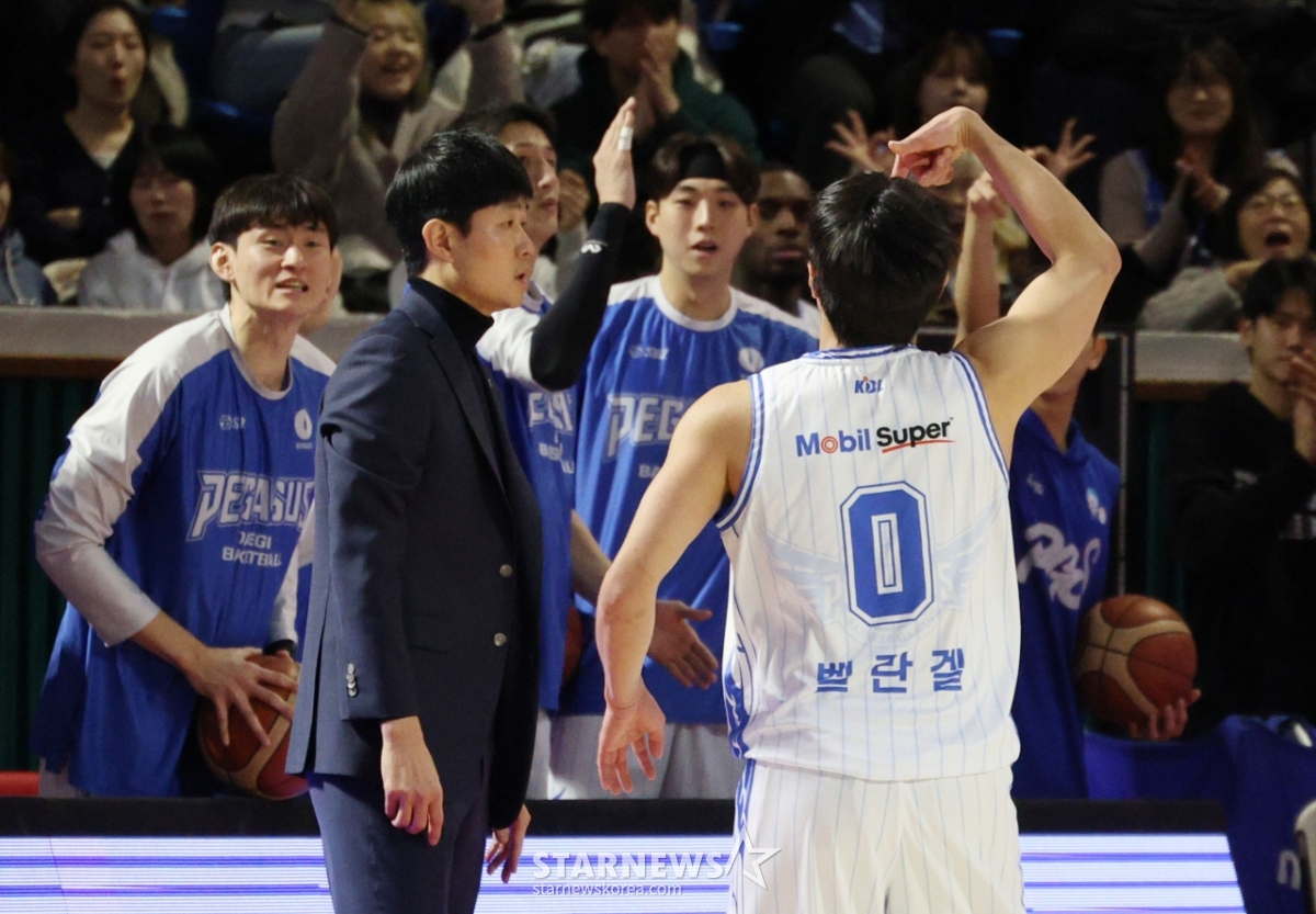 *此内容由AI翻译生成。24日,2025-2026 KBL职业篮球联赛首尔SK对大邱韩国天然气公社的比赛在首尔蚕室学生体育馆举行。图为天然气公司贝兰格尔(音)在投进决定性三分球后正在庆祝。© STARNEWS. 未经许可禁止转载或再分发*此内容由AI翻译生成。