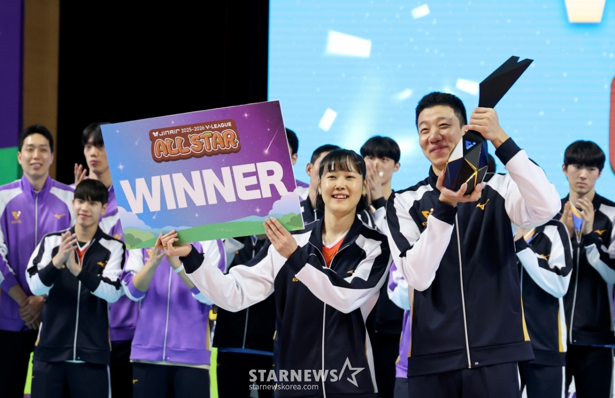25日,在春川湖畔体育馆举行的2025-2026真航空V联赛全明星赛结束后,K全明星申英锡和林明玉正在合影留念。 以K明星和V明星的对决进行的全明星赛,举行了扣球发球、自由人比赛等多种活动,给粉丝们带来了快乐。 2026. 01.25.
