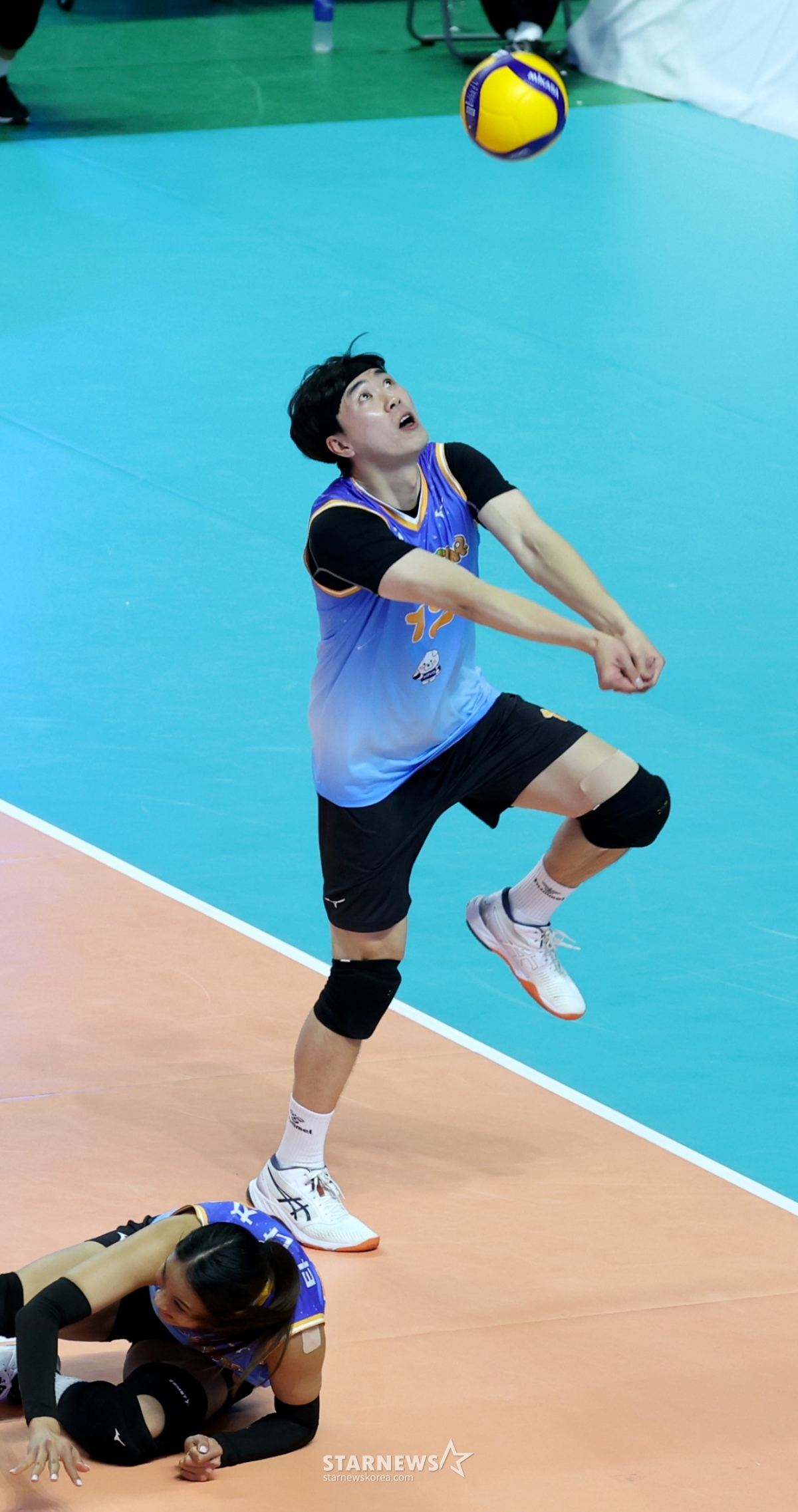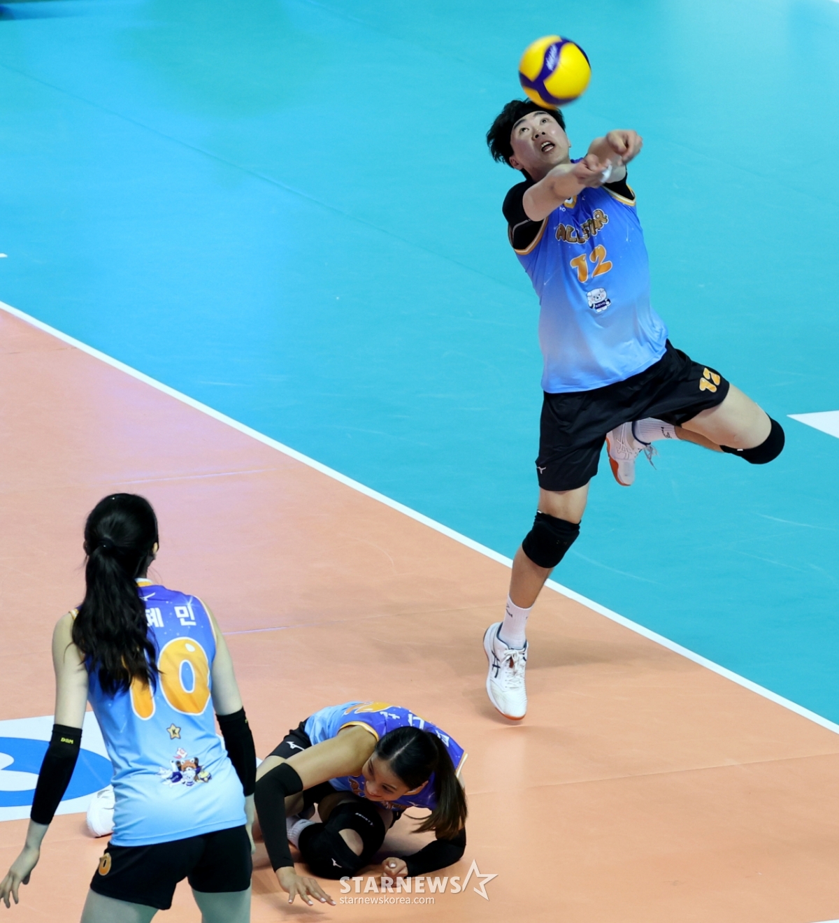 25日,在春川湖畔体育馆举行的2025-2026真航空V联赛全明星赛第二局女子组比赛中,K明星全光仁登场并得分后正在庆祝。 2026. 01.25.