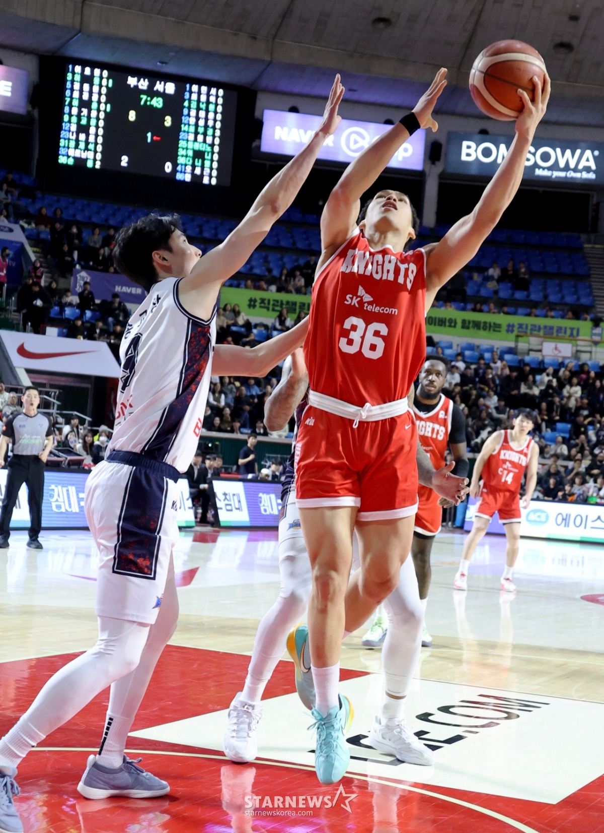 *此内容由AI翻译生成。2日,SK丹尼尔在蚕室学生体育馆举行的2025-2026LG电子职业篮球首尔SK队和釜山KCC队的比赛中,甩开宋教昌,试图投篮。 2026.02.02.© STARNEWS. 未经许可禁止转载或再分发*此内容由AI翻译生成。