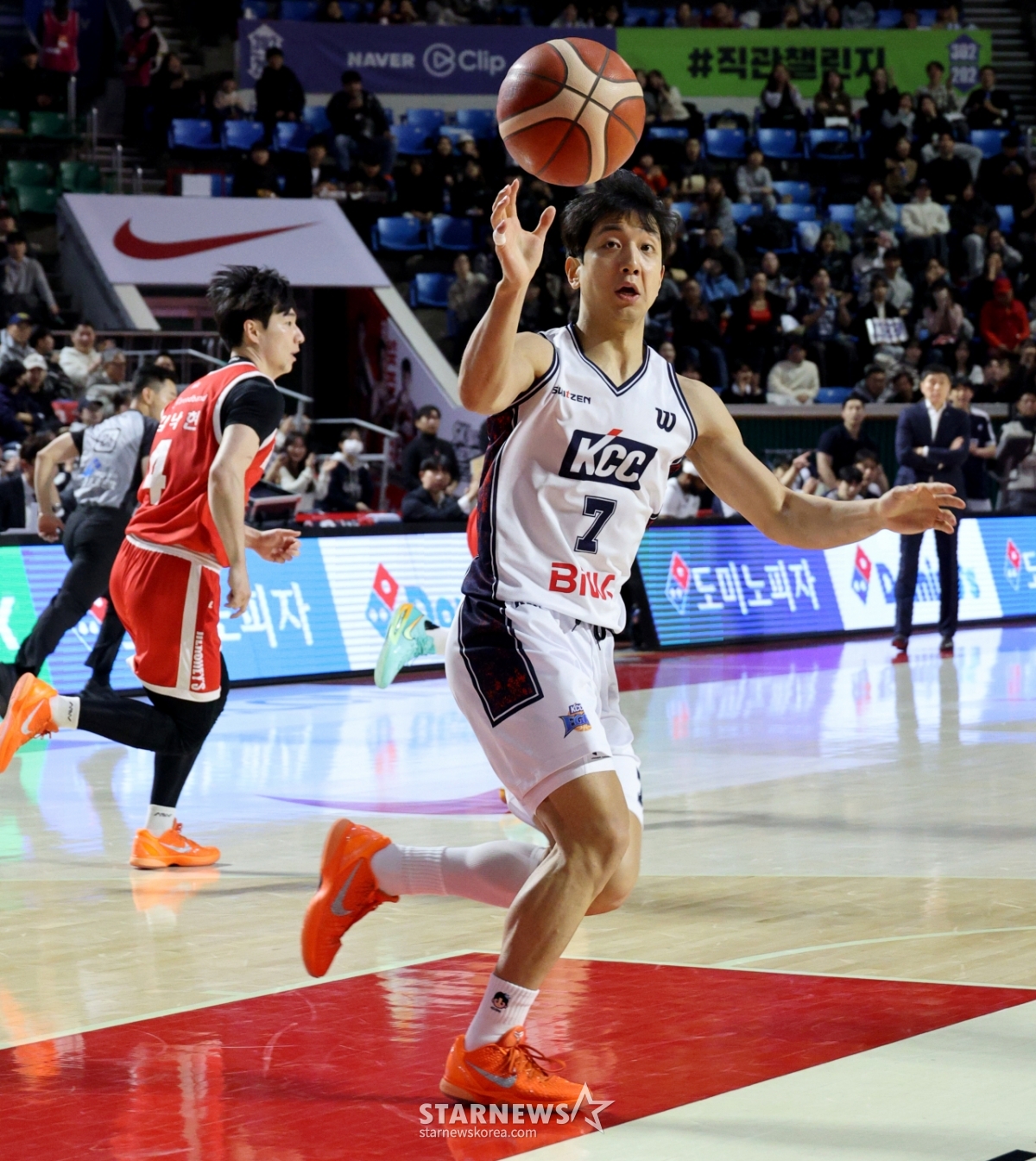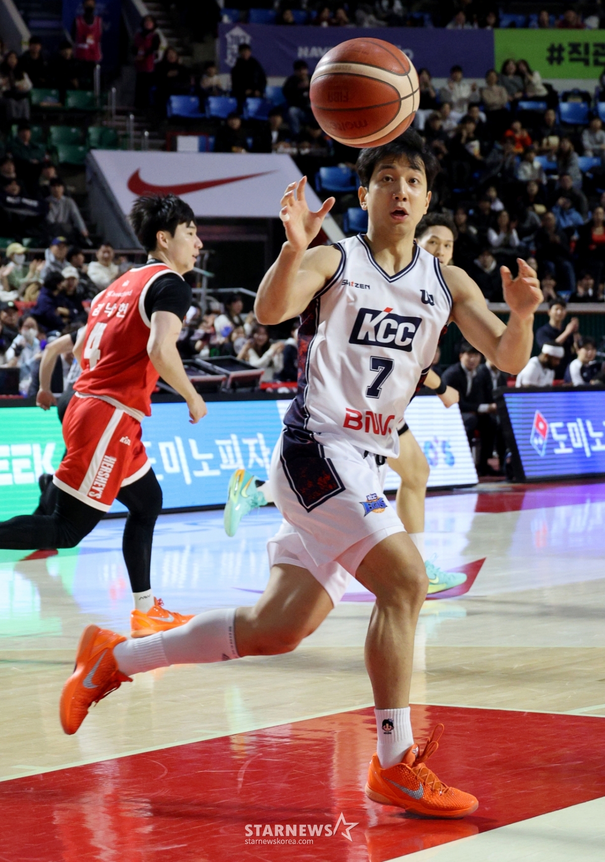 2日,在实学生体育馆举行的2025-2026LG电子职业篮球首尔SK队和釜山KCC队的比赛中,KCC队的许勋正在开始运球。 2026.02.02.