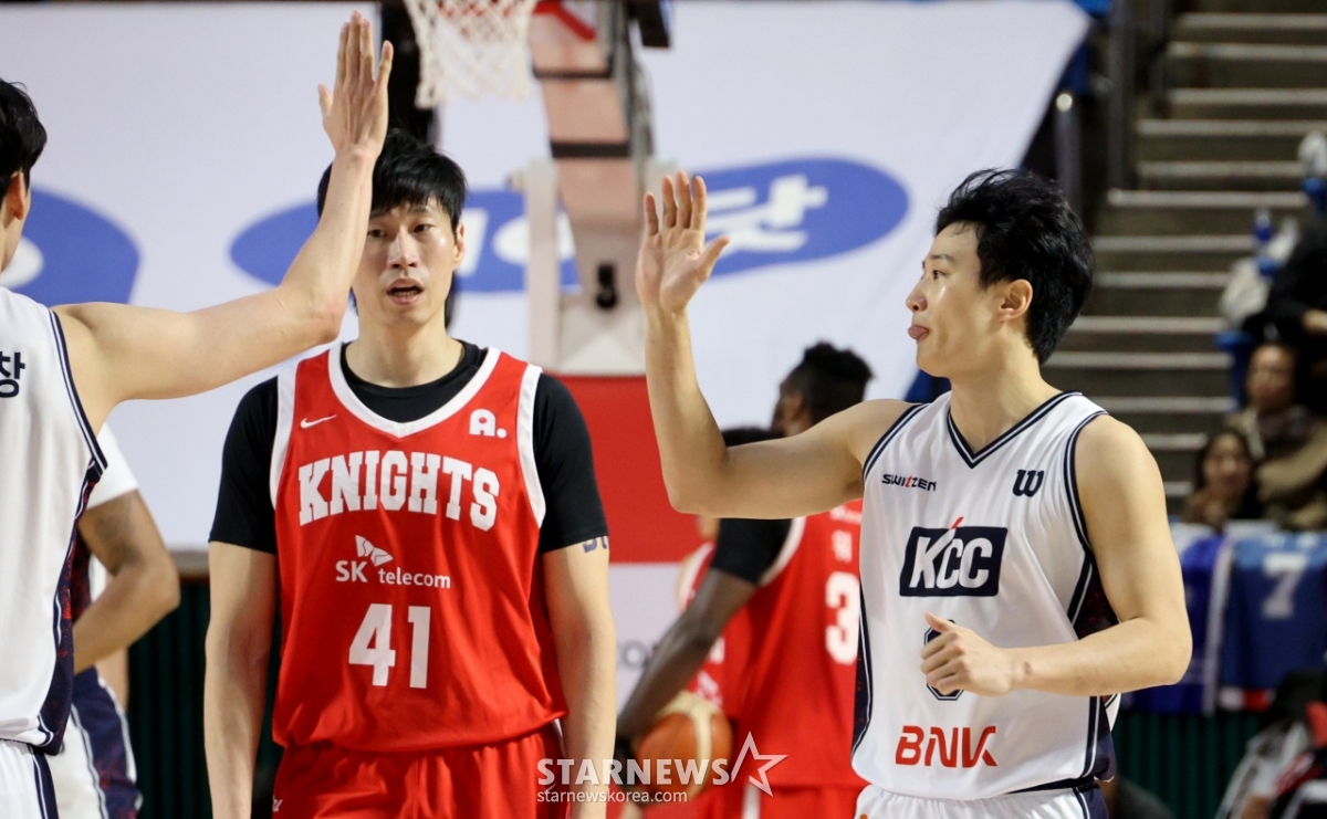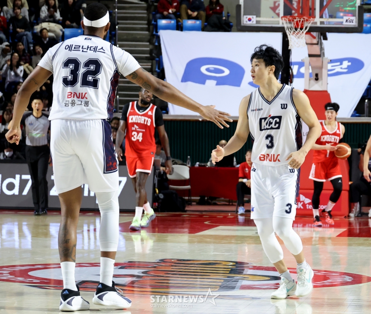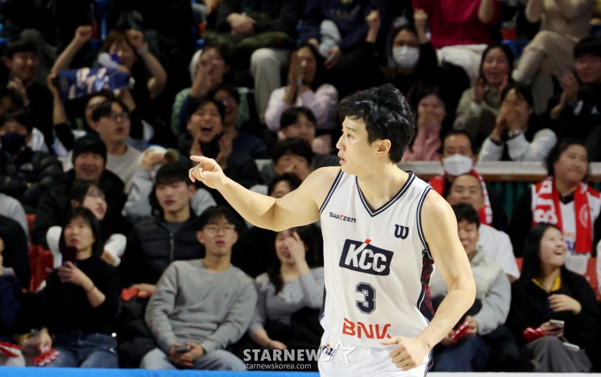 2日,在实学生体育馆举行的2025-2026LG电子职业篮球首尔SK队与釜山KCC队的比赛中,KCC队的许雄投进3分球后正在庆祝。 2026.02.02.