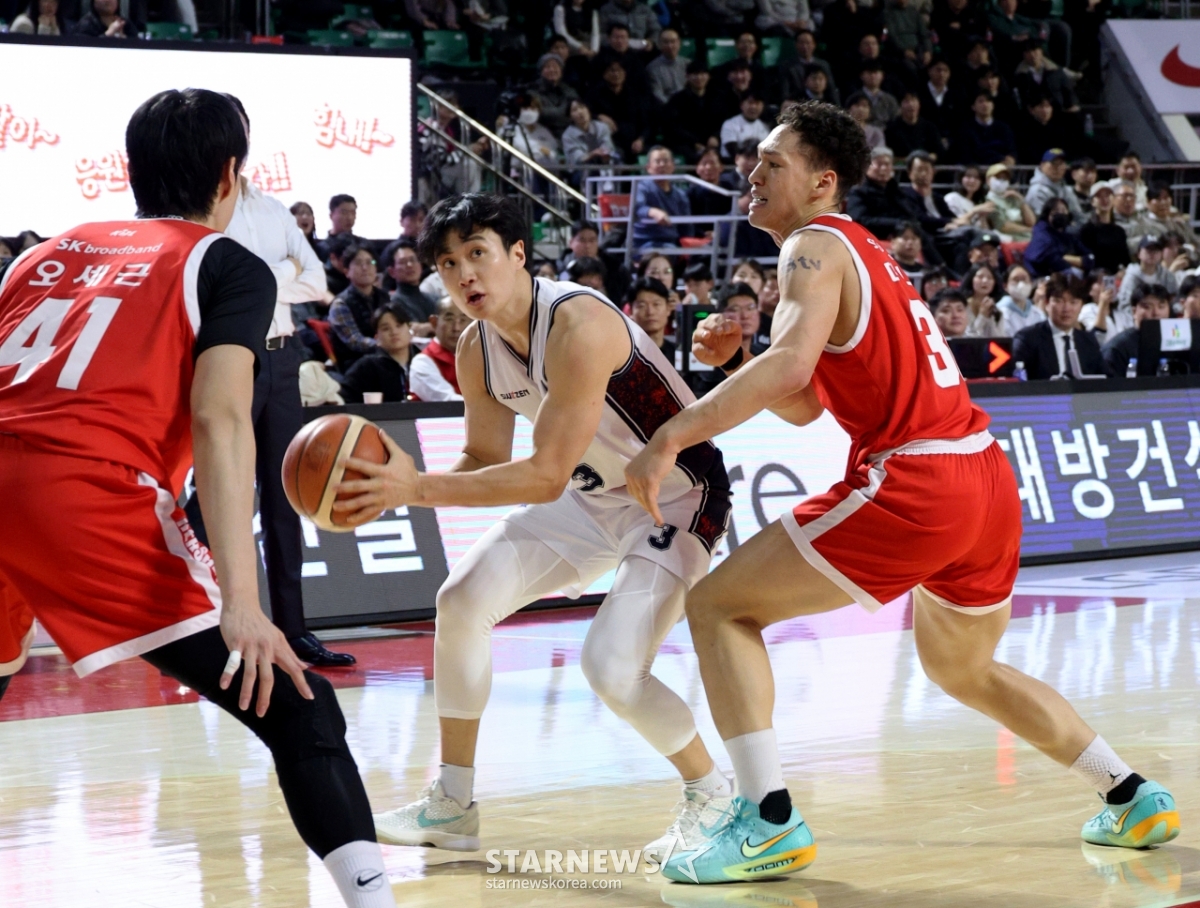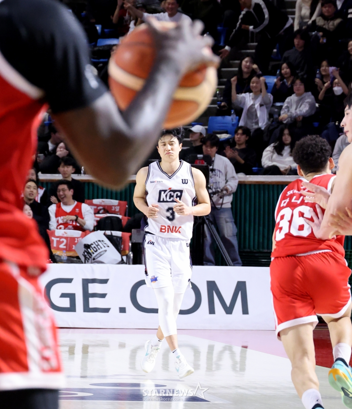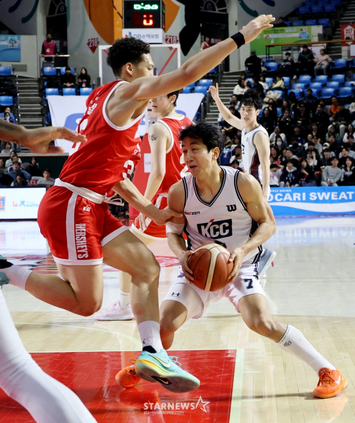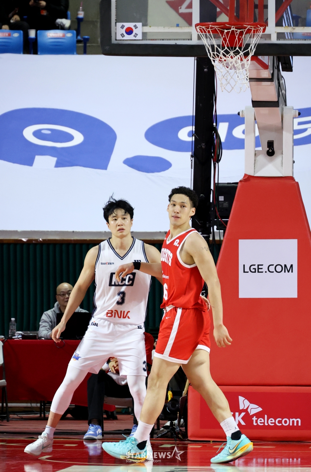 2日,在实学生体育馆举行的2025-2026LG电子职业篮球首尔SK队与釜山KCC队的比赛中,KCC队的许勋试图突破侧面后,丹尼尔正在防守。 2026.02.02.