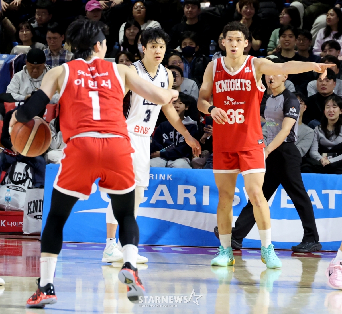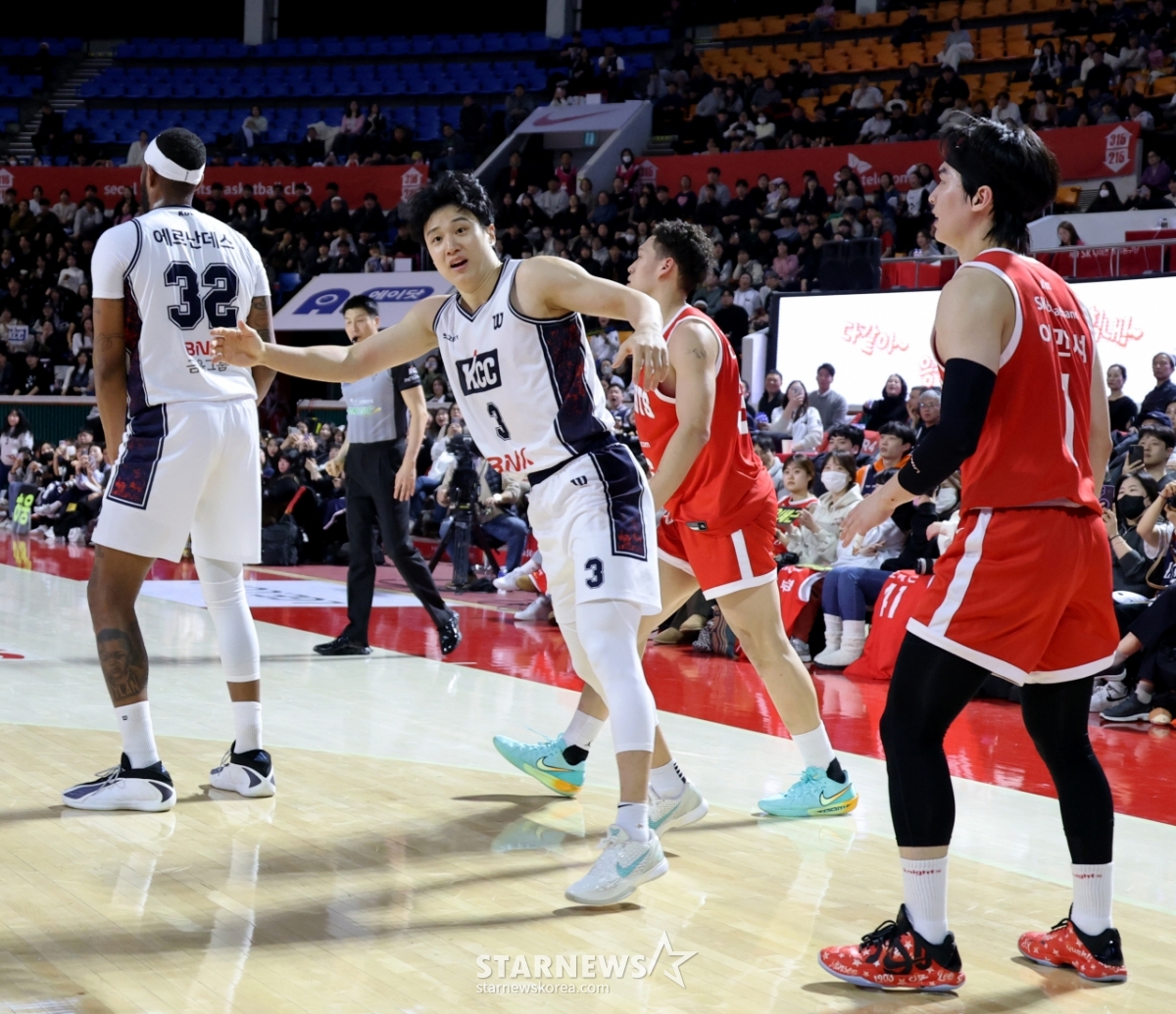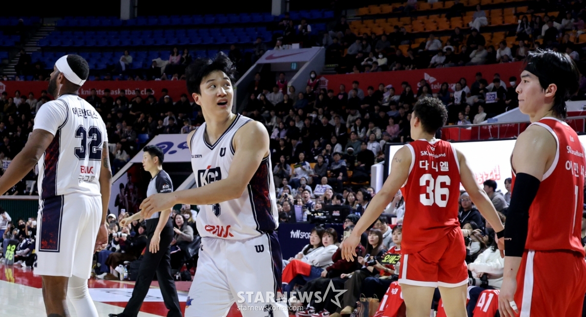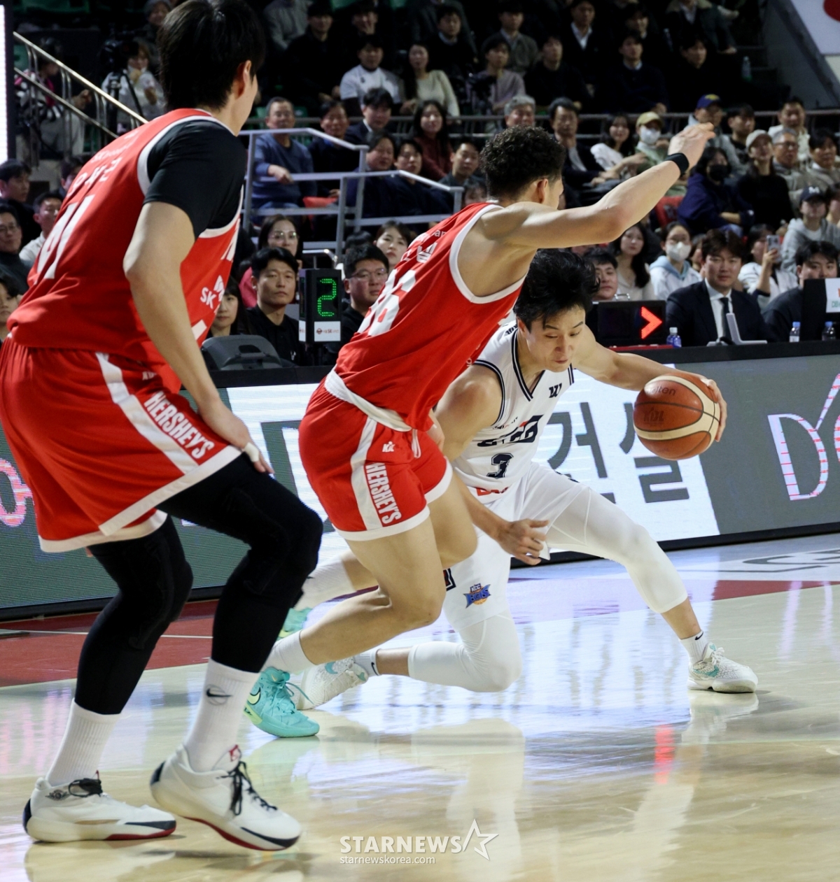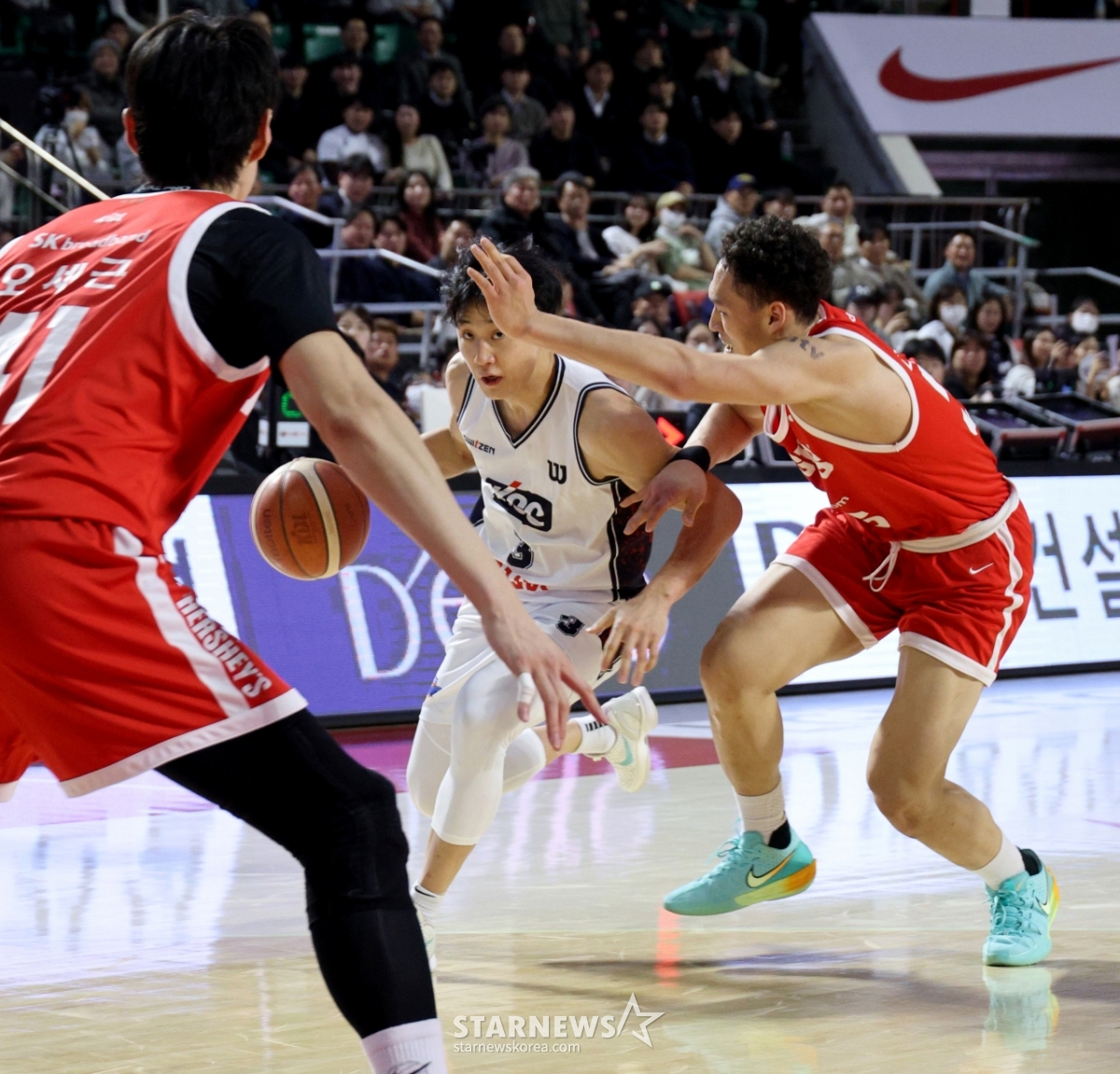 2日,在实学生体育馆举行的2025-2026LG电子职业篮球首尔SK队与釜山KCC队的比赛中,KCC队的许勋试图突破侧面后,丹尼尔正在防守。 2026.02.02.