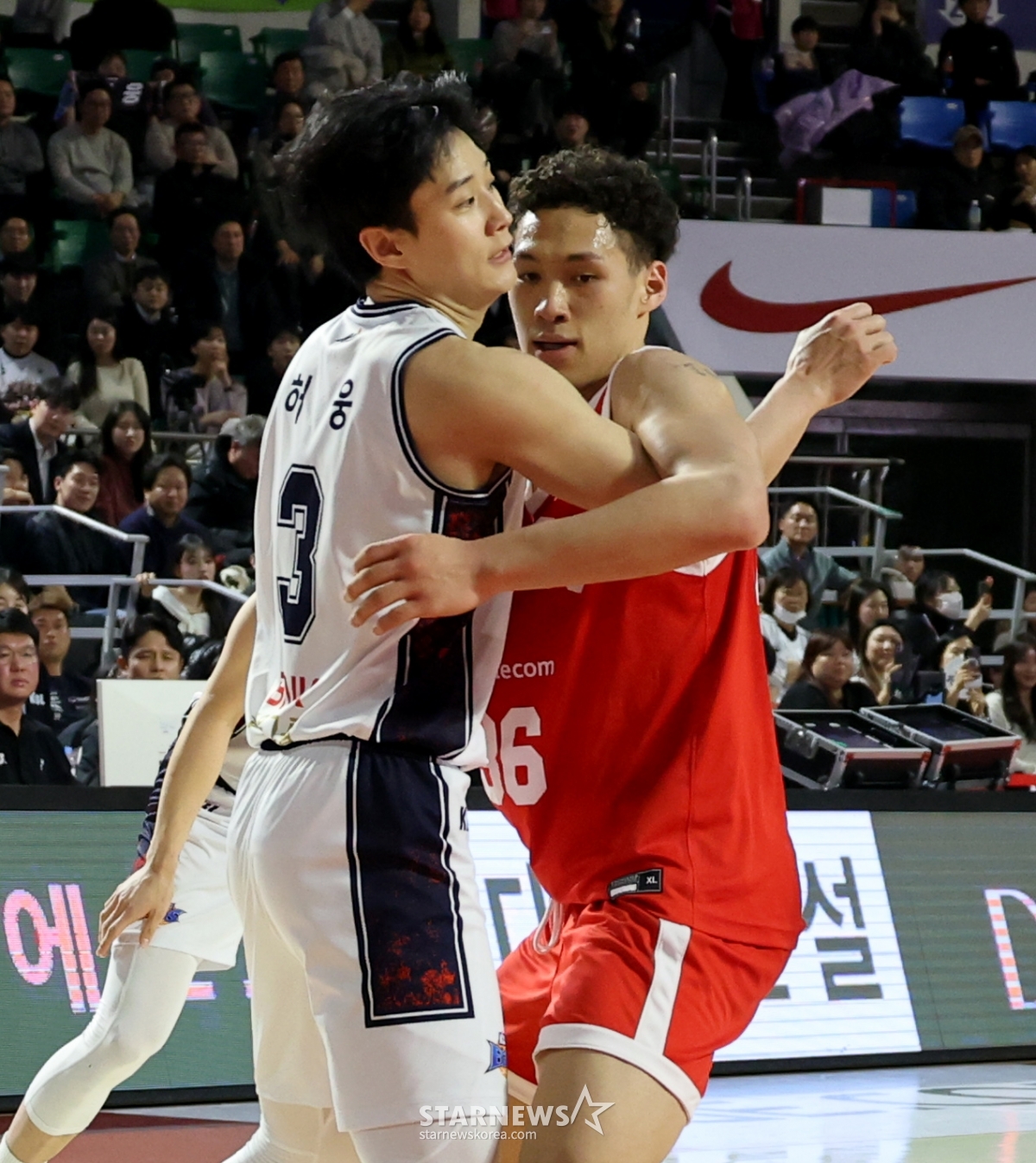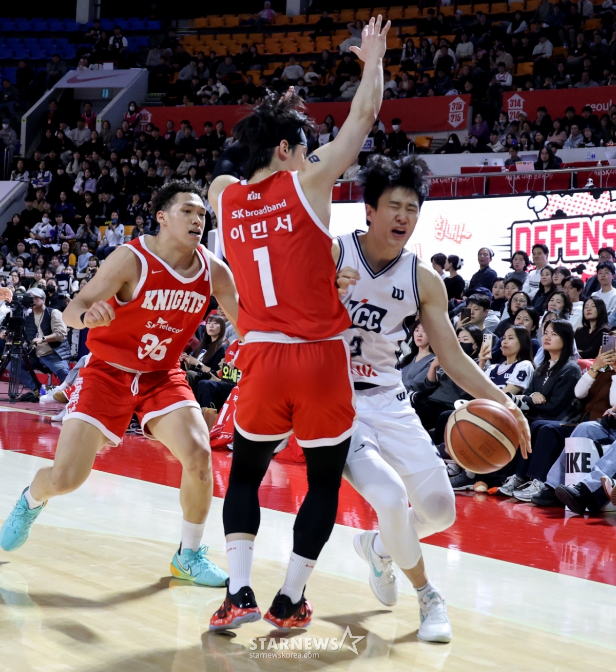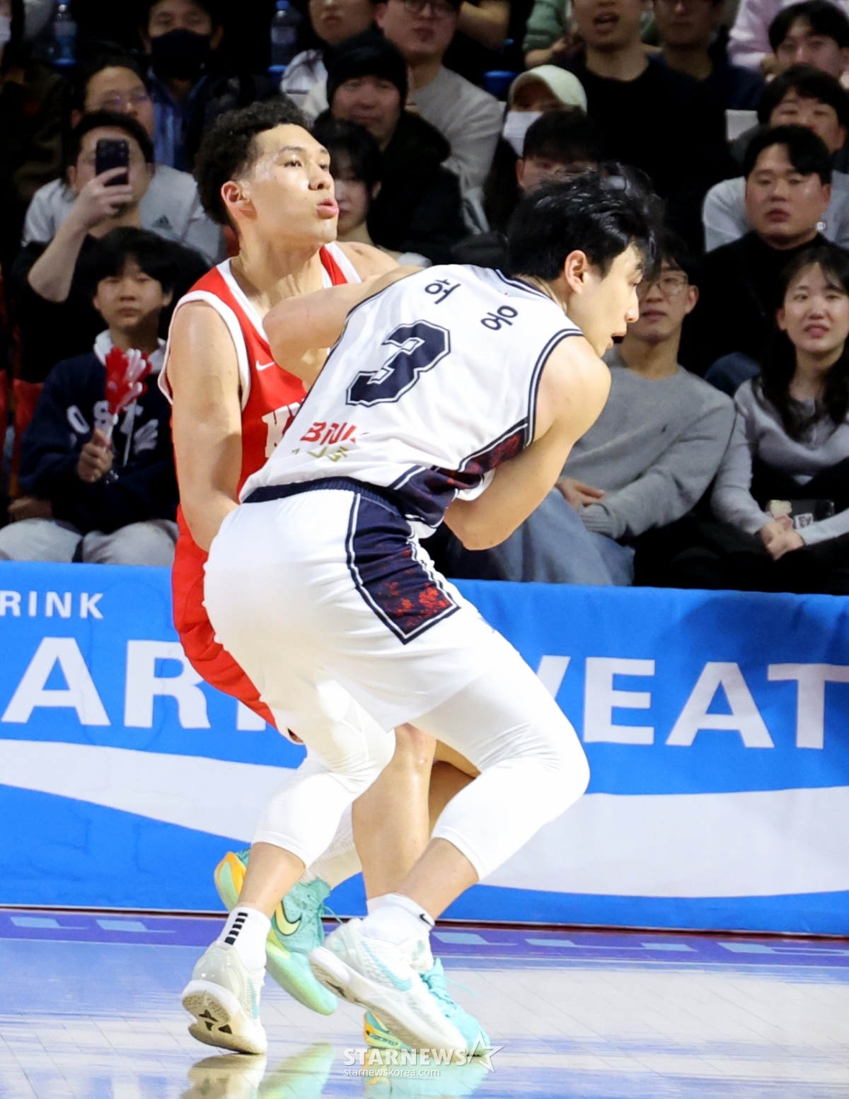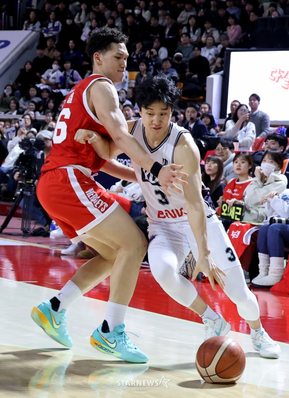 2日,在实学生体育馆举行的2025-2026年LG电子职业篮球联赛首尔SK队与釜山KCC队的比赛中,取得51分的KCC队许雄试图从侧面突破,丹尼尔不惜犯规,正在积极贴身防守。