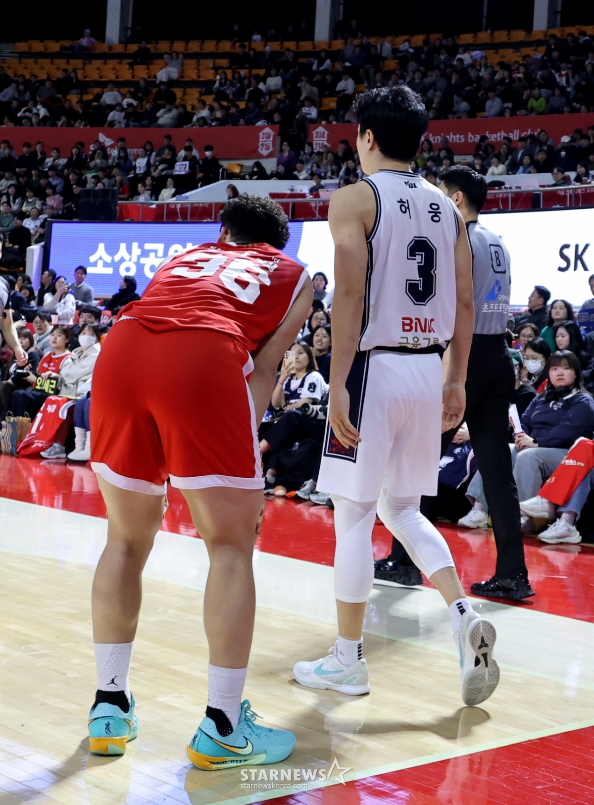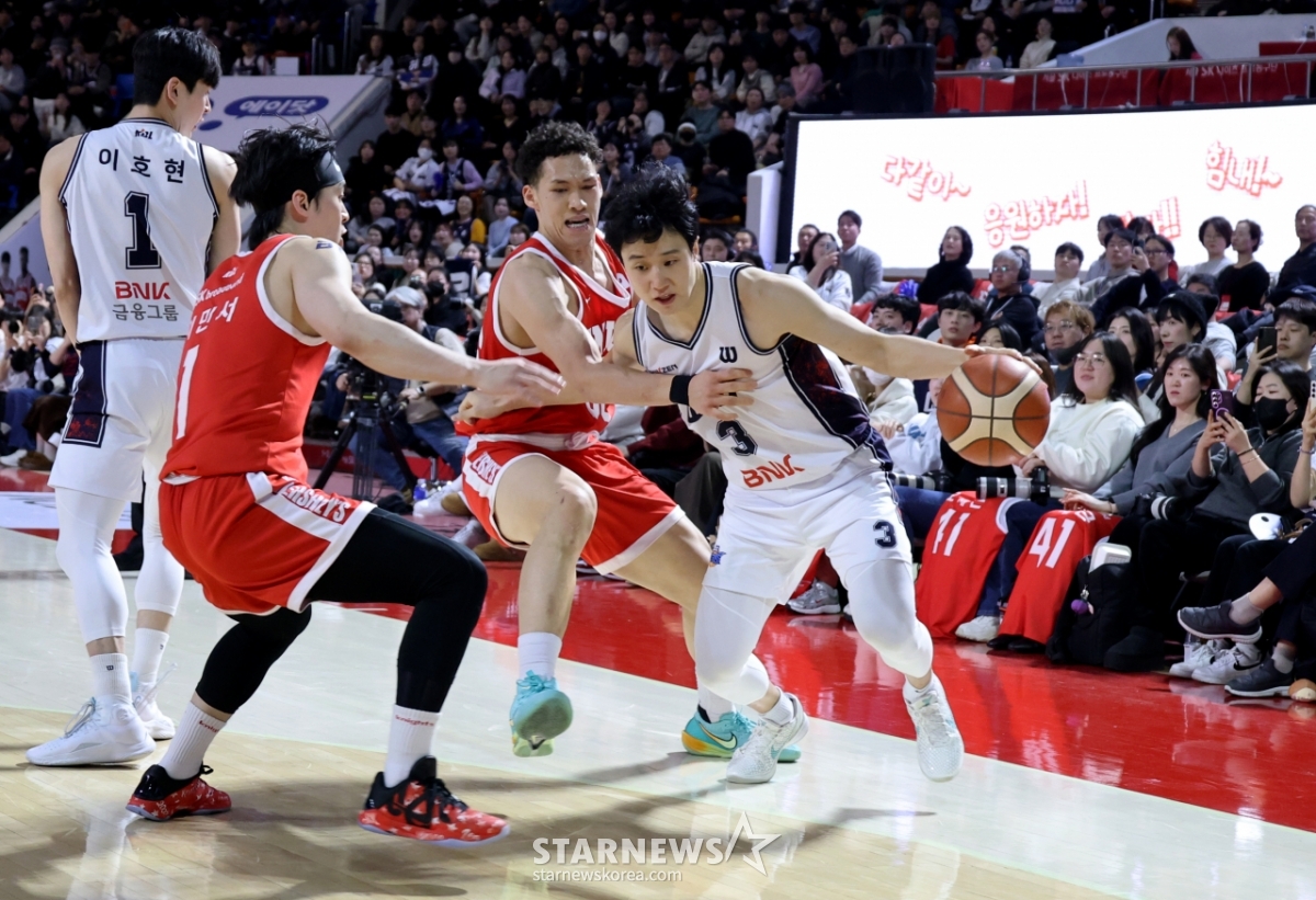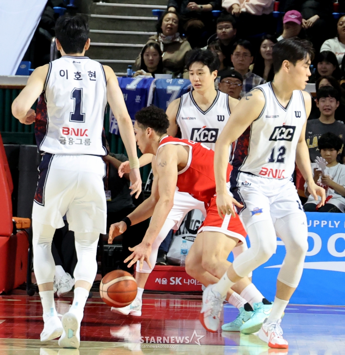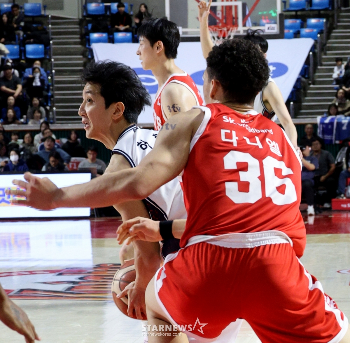 2日,在实学生体育馆举行的2025-2026年LG电子职业篮球联赛首尔SK队与釜山KCC队的比赛中,取得51分的KCC队许雄试图从侧面突破,丹尼尔不惜犯规,正在积极贴身防守。