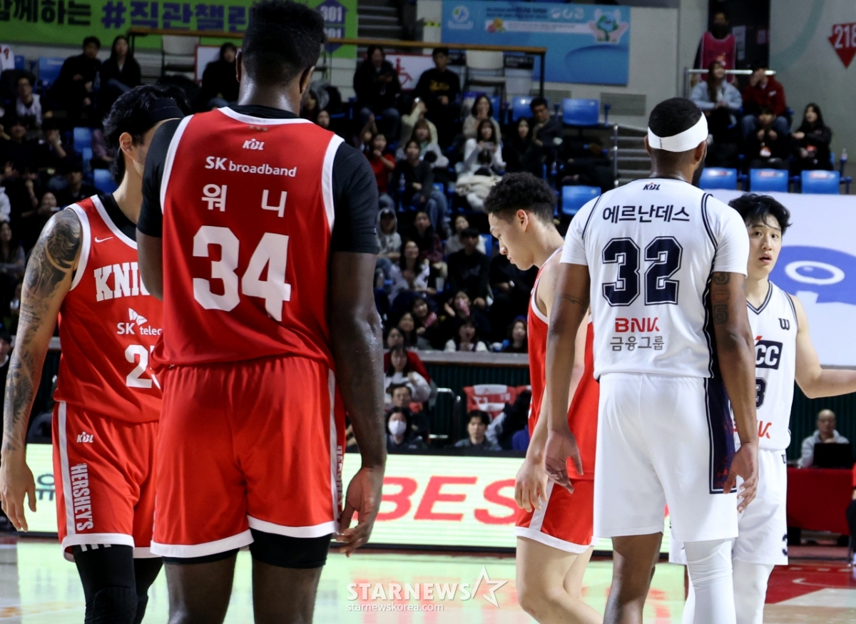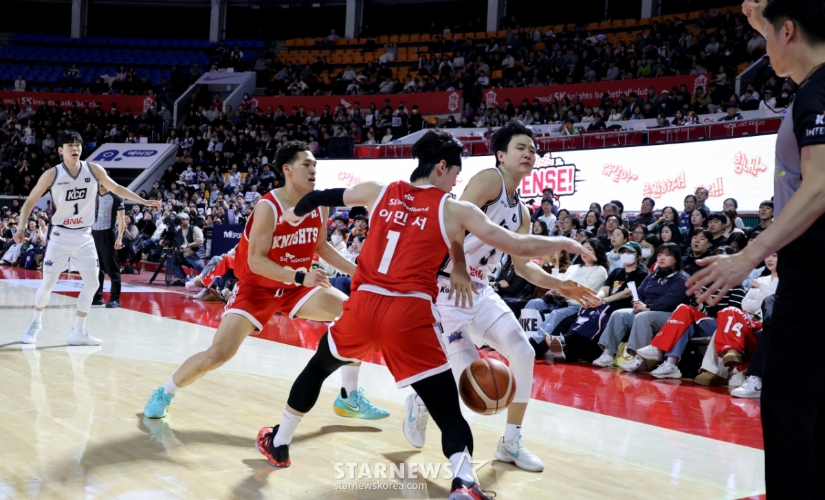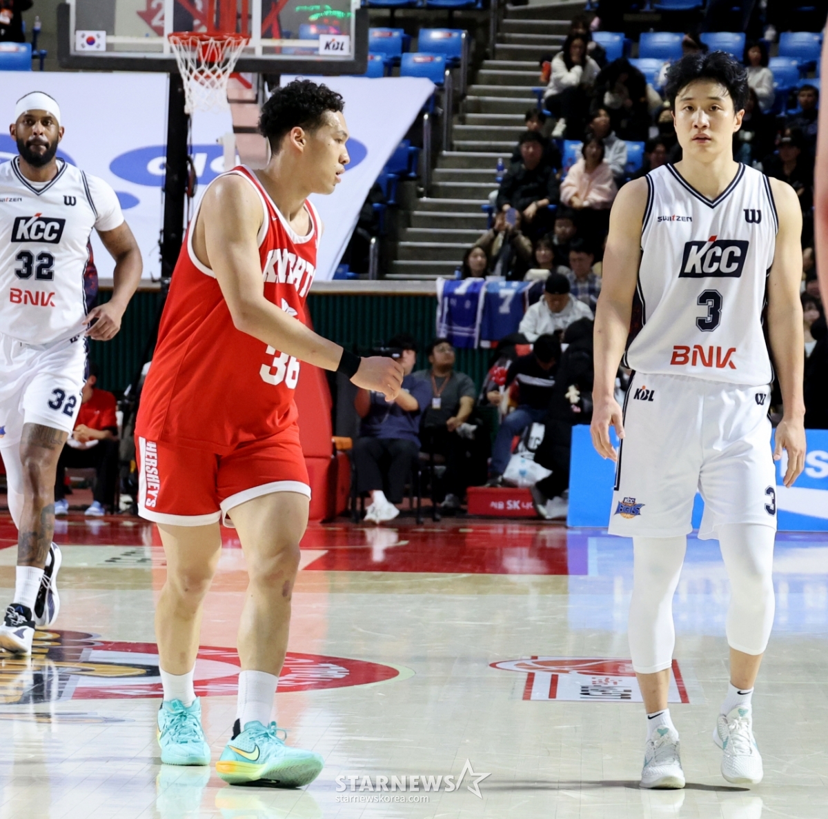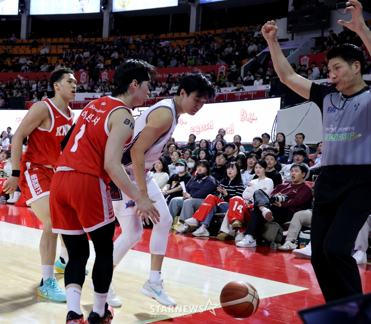 2日,在实学生体育馆举行的2025-2026年LG电子职业篮球联赛首尔SK队与釜山KCC队的比赛中,取得51分的KCC队许雄试图从侧面突破,丹尼尔不惜犯规,正在积极贴身防守。