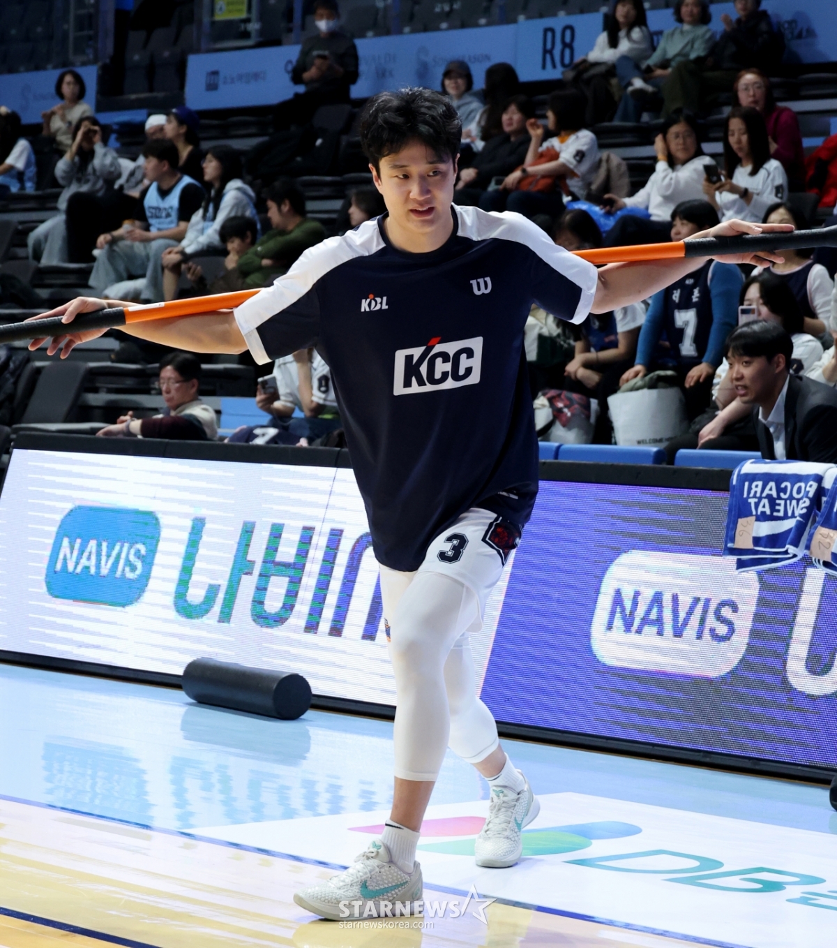 4日,在高阳索诺竞技场举行的2025-2026LG电子职业篮球高阳索诺和釜山KCC比赛之前,KCC许雄正在利用球热身。 2026.02.04.