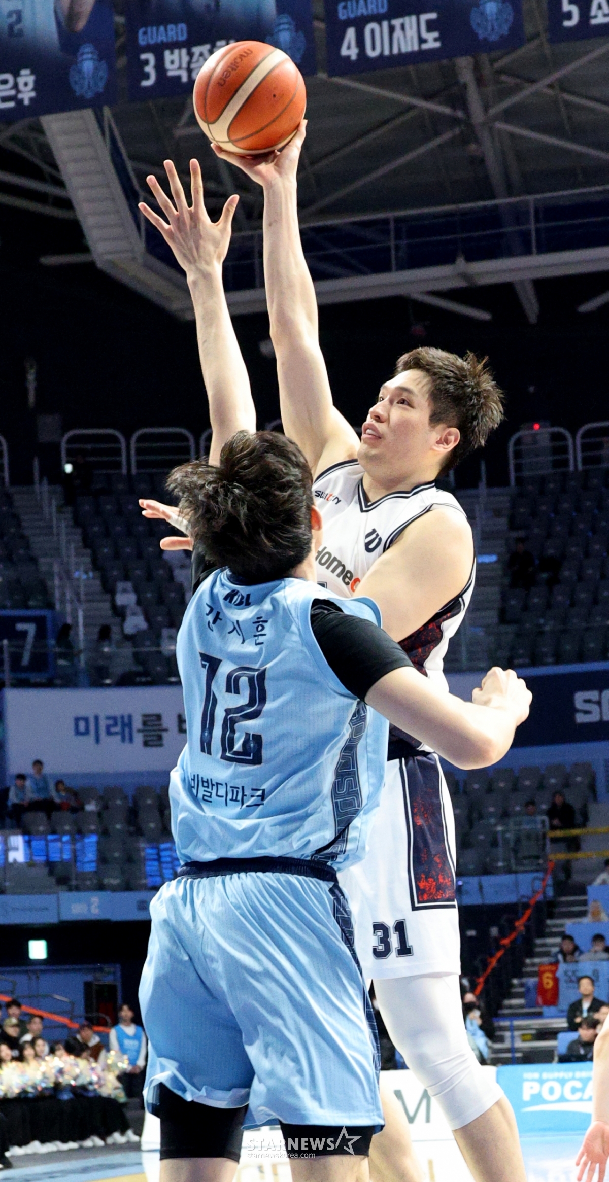 *此内容由AI翻译生成。4日,在高阳索诺竞技场举行的2025-2026LG电子职业篮球高阳索诺和釜山KCC队的比赛中,KCC张在锡正在接受姜志勋的标记,进行钩球射门。 2026.02.04.© STARNEWS. 未经许可禁止转载或再分发*此内容由AI翻译生成。