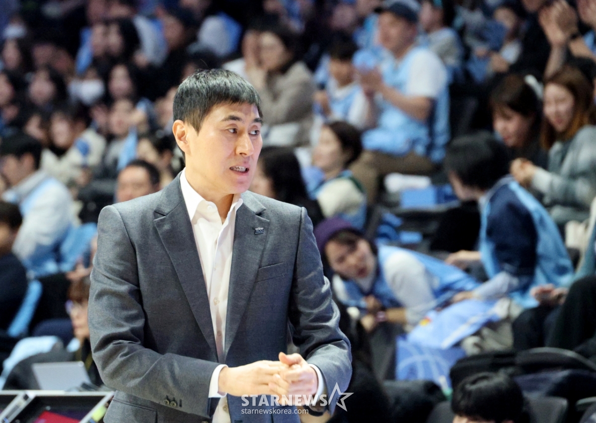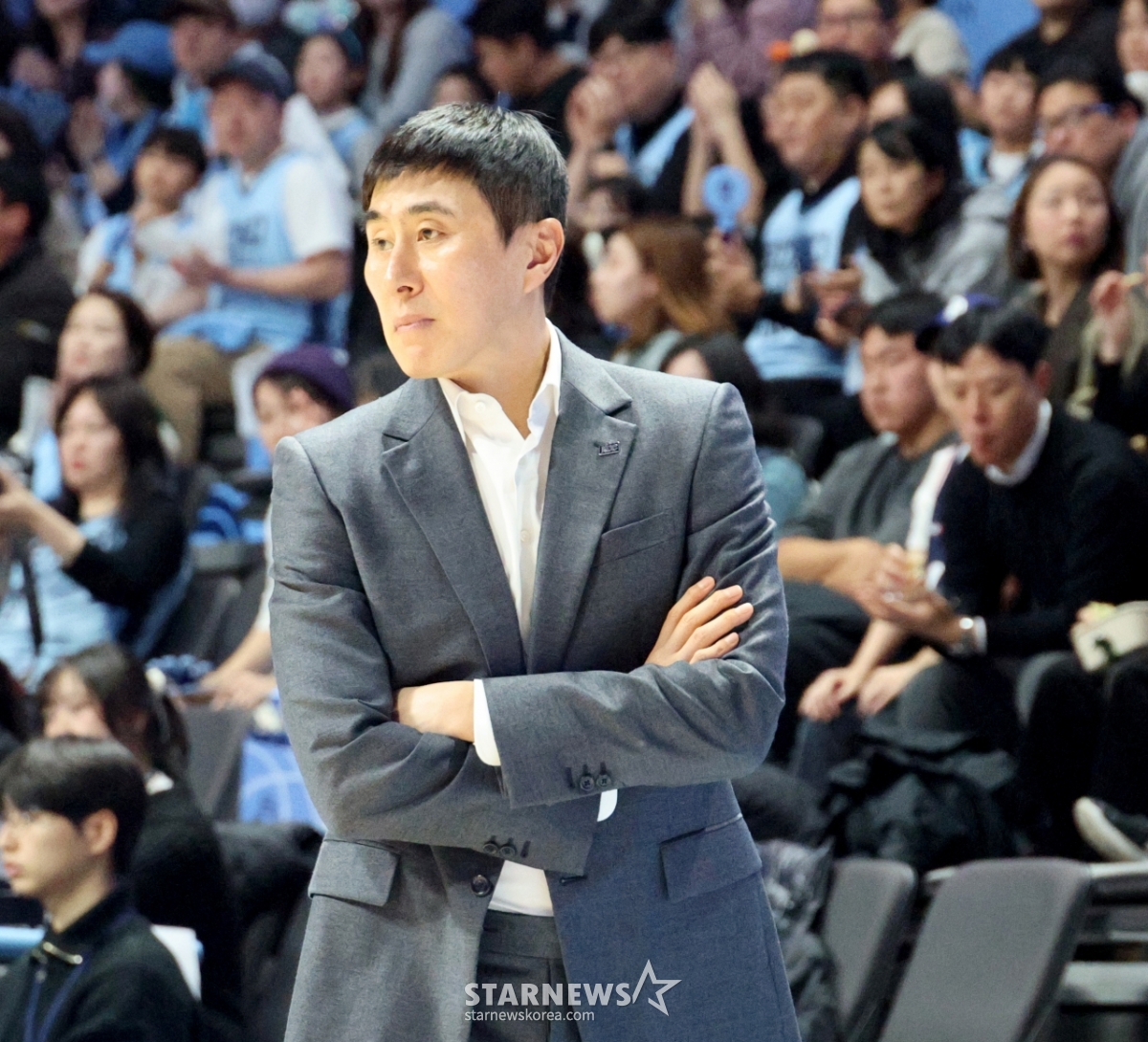 4日,在高阳索诺竞技场举行的2025-2026LG电子职业篮球高阳索诺和釜山KCC队的比赛中,KCC队主教练李相民正在凝视球场。 2026.02.04.