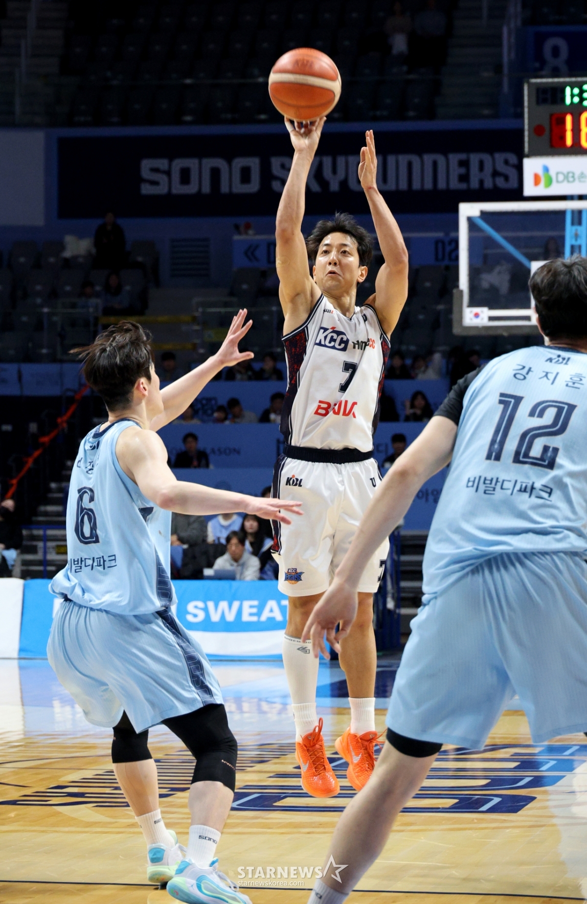 4日,在高阳索诺竞技场举行的2025-2026LG电子职业篮球高阳索诺和釜山KCC队的比赛中,KCC许勋正在尝试远射。 2026.02.04.