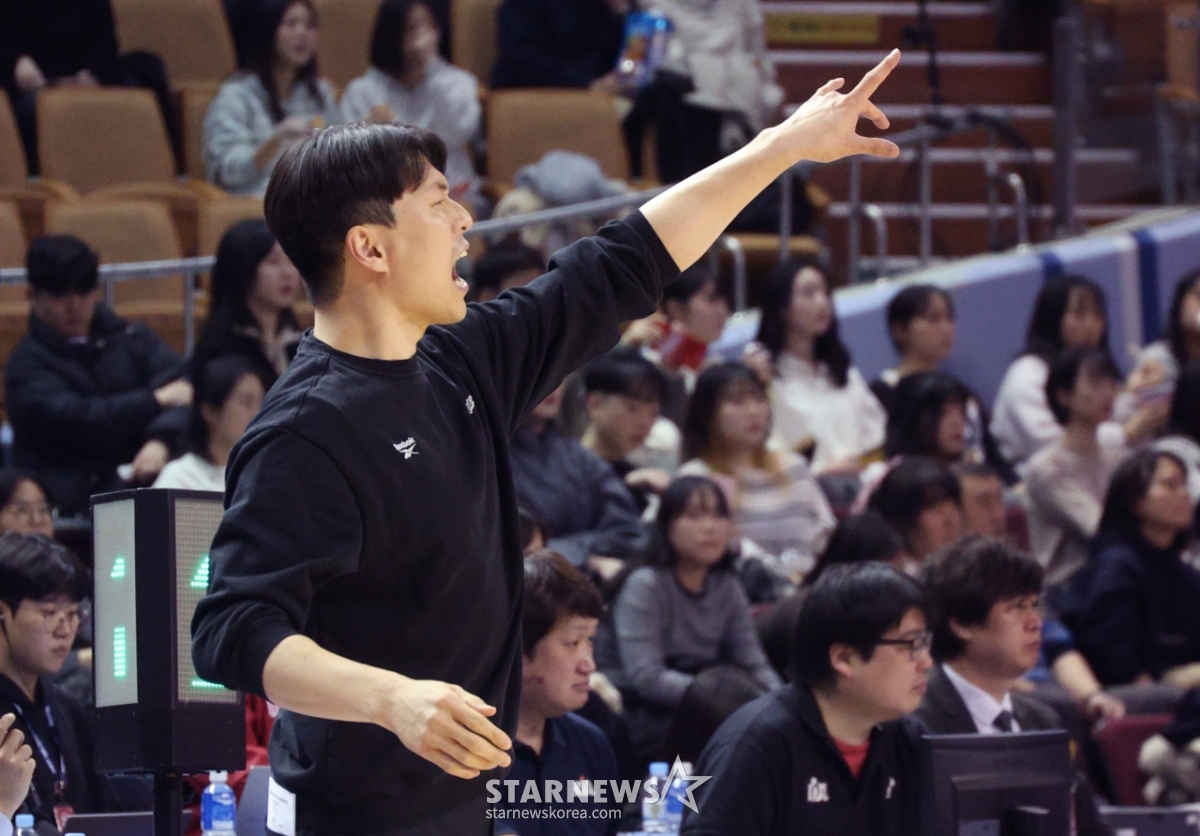 *此内容由AI翻译生成。5日,2025-2026 KBL职业篮球联赛首尔三星队对昌原LG队的比赛在首尔蚕室室内体育馆举行。图为三星队主教练金孝范正在下达作战指示。© STARNEWS. 未经许可禁止转载或再分发*此内容由AI翻译生成。