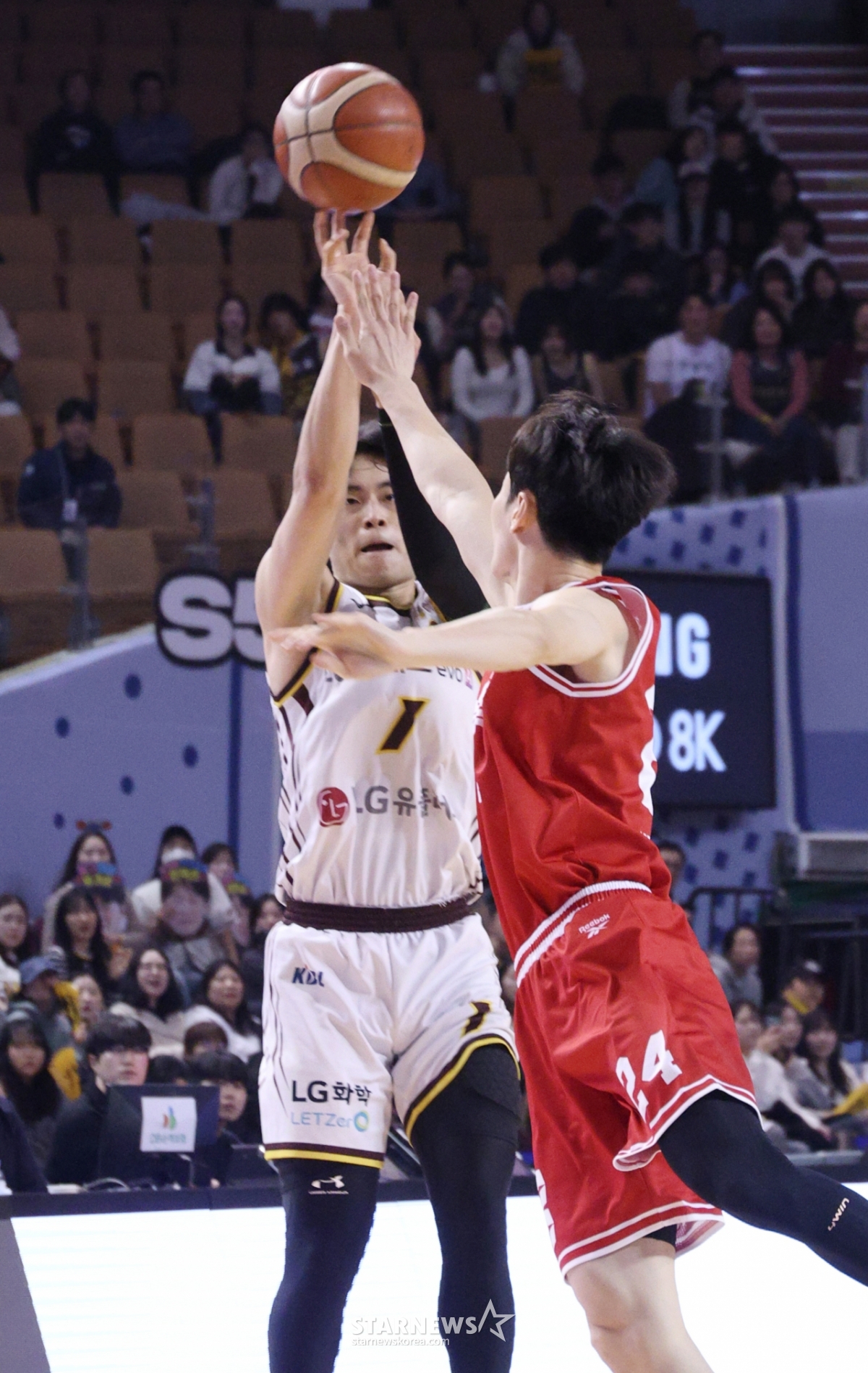 *此内容由AI翻译生成。5日,2025-2026 KBL职业篮球联赛首尔三星队对昌原LG队的比赛在首尔蚕室室内体育馆举行。LG队的柳基相正试图超越三星队的申东赫投进3分球。© STARNEWS. 未经许可禁止转载或再分发*此内容由AI翻译生成。