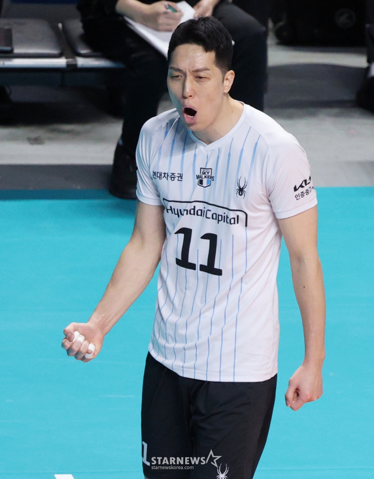 *此内容由AI翻译生成。6日,在首尔奖忠体育馆举行了2025-2026 V-联赛男子组友利信用卡对现代资本的比赛。图为现代capital队的崔敏浩(音)在进攻成功后正在欢呼。© STARNEWS. 未经许可禁止转载或再分发*此内容由AI翻译生成。
