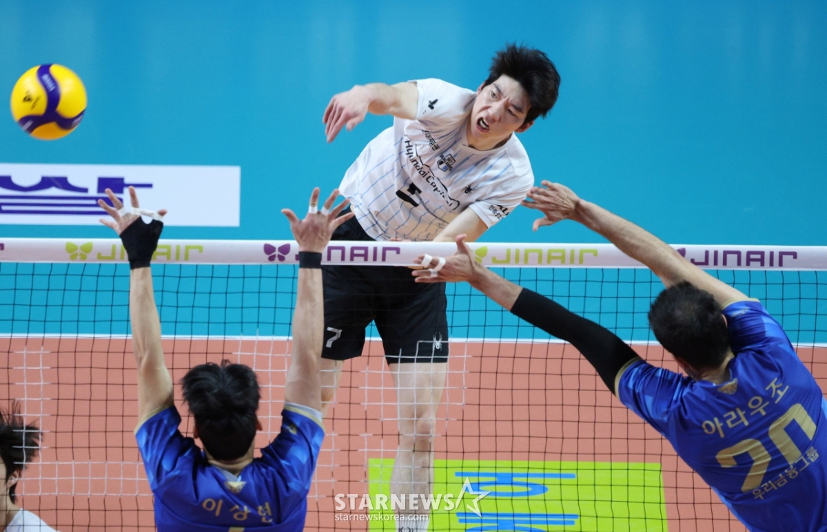 *此内容由AI翻译生成。6日,在首尔奖忠体育馆举行了2025-2026 V-联赛男子组友利信用卡对现代资本的比赛。现代Capital队的许秀峰(音)正在友利信用卡队的李尚贤(音)、阿劳佐(音)的拦网上强力扣球。© STARNEWS. 未经许可禁止转载或再分发*此内容由AI翻译生成。