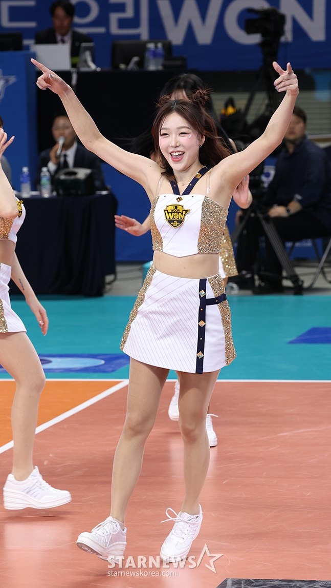 *此内容由AI翻译生成。6日,在首尔奖忠体育馆举行了2025-2026 V-联赛男子组友利信用卡对现代资本的比赛。友利信用卡拉拉队队长李珠熙正在清爽地助威。© STARNEWS. 未经许可禁止转载或再分发*此内容由AI翻译生成。