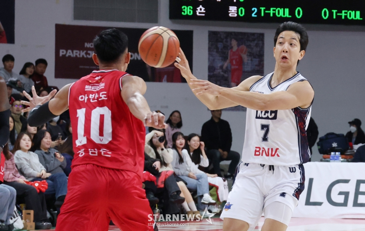 *此内容由AI翻译生成。7日,2025-2026LG电子职业篮球安养正官庄对釜山KCC的比赛在京畿道安养正官庄竞技场举行。KCC许勋哥正在给许雄传球。© STARNEWS. 未经许可禁止转载或再分发*此内容由AI翻译生成。
