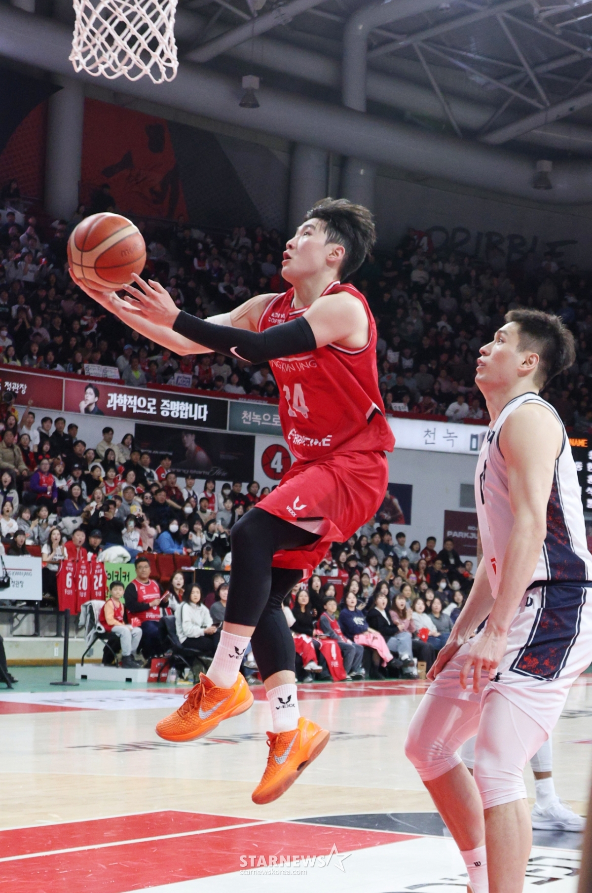 KCC队的文裕贤力压正官庄张在锡,正在篮下投篮。