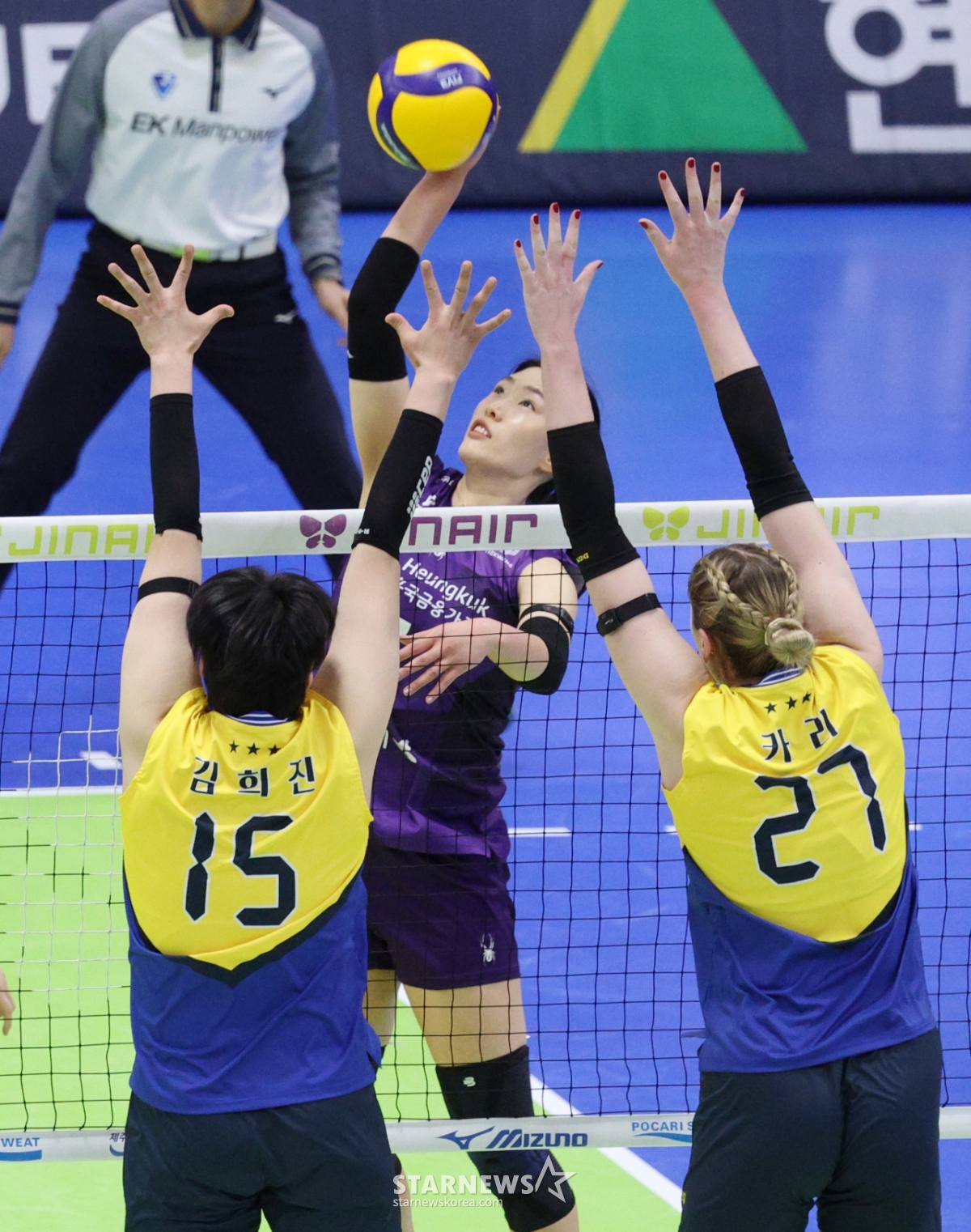 *此内容由AI翻译生成。9日,2025-2026 V-联赛女子组现代建设对兴国生命的比赛在京畿道水原体育馆举行。兴国生命队的崔恩智正在现代建设队的金熙珍(音)、卡里的拦网上连续击出。© STARNEWS. 未经许可禁止转载或再分发*此内容由AI翻译生成。