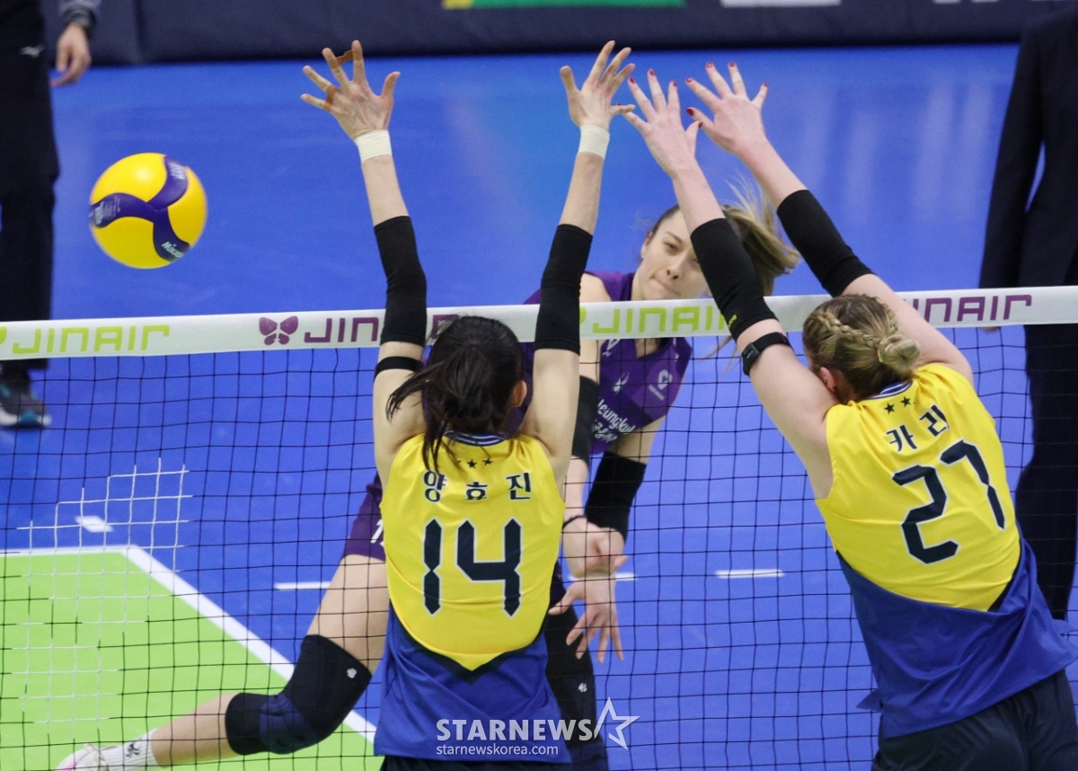 *此内容由AI翻译生成。9日,2025-2026 V-联赛女子组现代建设对兴国生命的比赛在京畿道水原体育馆举行。兴国生命队的丽贝卡正在现代建设队的梁孝珍、卡里的拦网上强力扣球。© STARNEWS. 未经许可禁止转载或再分发*此内容由AI翻译生成。