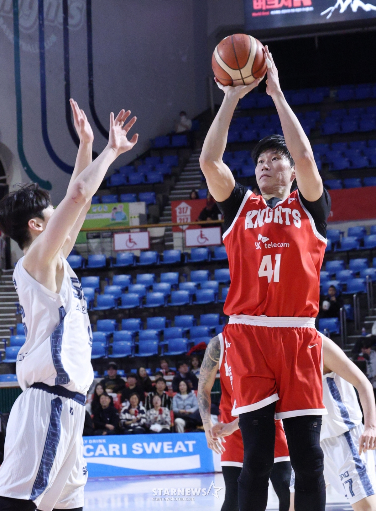 *此内容由AI翻译生成。11日,2025-2026 KBL职业篮球联赛首尔SK对高阳索诺的比赛在首尔蚕室学生体育馆举行。SK队的吴世根(音译)力压索诺队的李贞铉,正在试图投篮。© STARNEWS. 未经许可禁止转载或再分发*此内容由AI翻译生成。