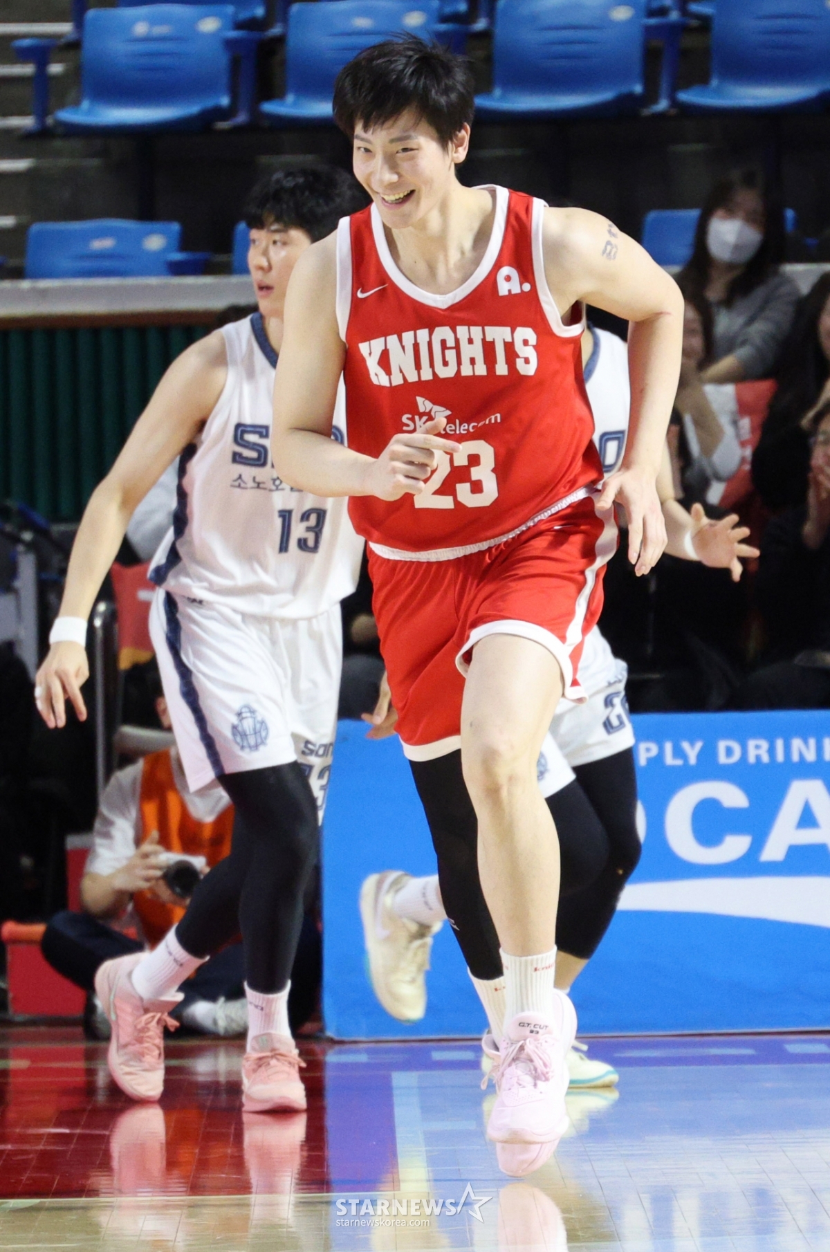 *此内容由AI翻译生成。11日,2025-2026 KBL职业篮球联赛首尔SK对高阳索诺的比赛在首尔蚕室学生体育馆举行。图为SK队的金亨彬(音)在快攻成功后,表情明朗地站在后场。© STARNEWS. 未经许可禁止转载或再分发*此内容由AI翻译生成。