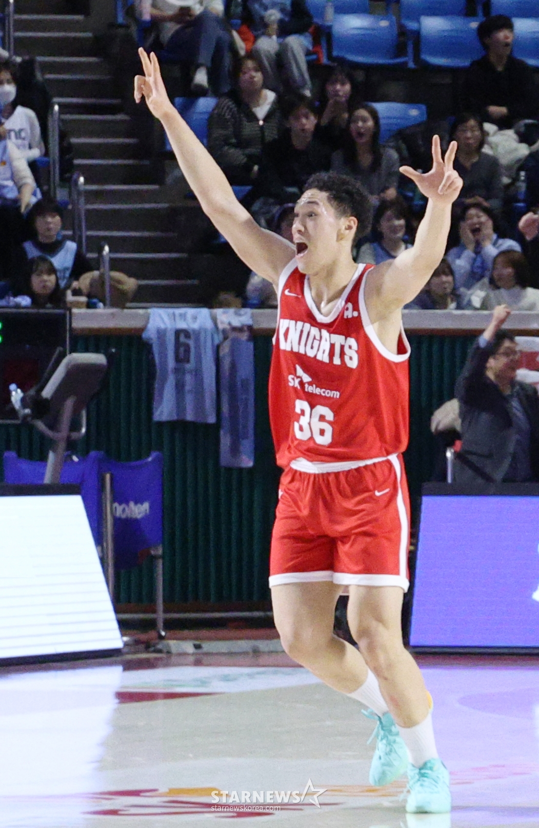 *此内容由AI翻译生成。11日,2025-2026 KBL职业篮球联赛首尔SK对高阳索诺的比赛在首尔蚕室学生体育馆举行。SK队的丹尼尔在第三节结束时,看到梦露的压哨声,欢呼雀跃。© STARNEWS. 未经许可禁止转载或再分发*此内容由AI翻译生成。
