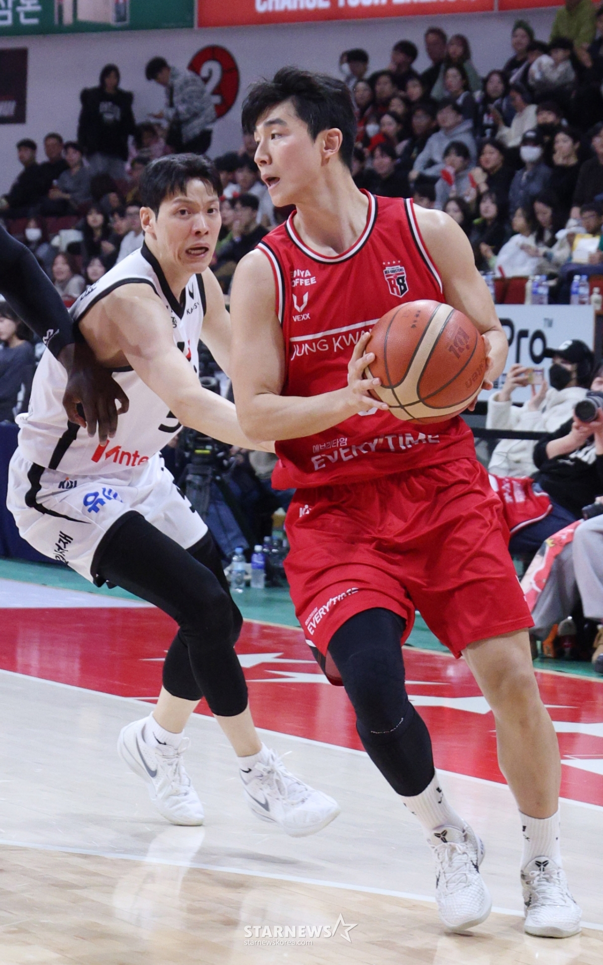 *此内容由AI翻译生成。13日,2025-2026LG电子职业篮球安养正官庄对水原KT的比赛在京畿道安养正官庄竞技场举行。正官庄朴志训正试图超越KT金善亨,获得射门机会。© STARNEWS. 未经许可禁止转载或再分发*此内容由AI翻译生成。