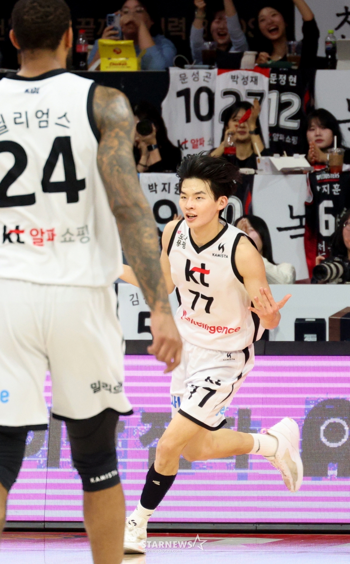 KT姜成旭(音)在闪电快攻成功后正在庆祝。