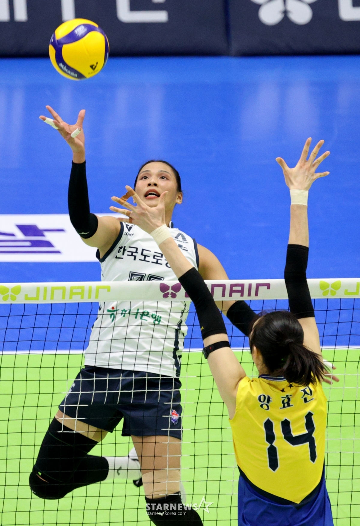 *此内容由AI翻译生成。13日,在水原体育馆举行的2025-2026真航空V联赛现代建设队和韩国道路公社队的比赛中,由于时机不对,多罗塔纳查队正在试图将其推进。 2026.02.13.© STARNEWS. 未经许可禁止转载或再分发*此内容由AI翻译生成。