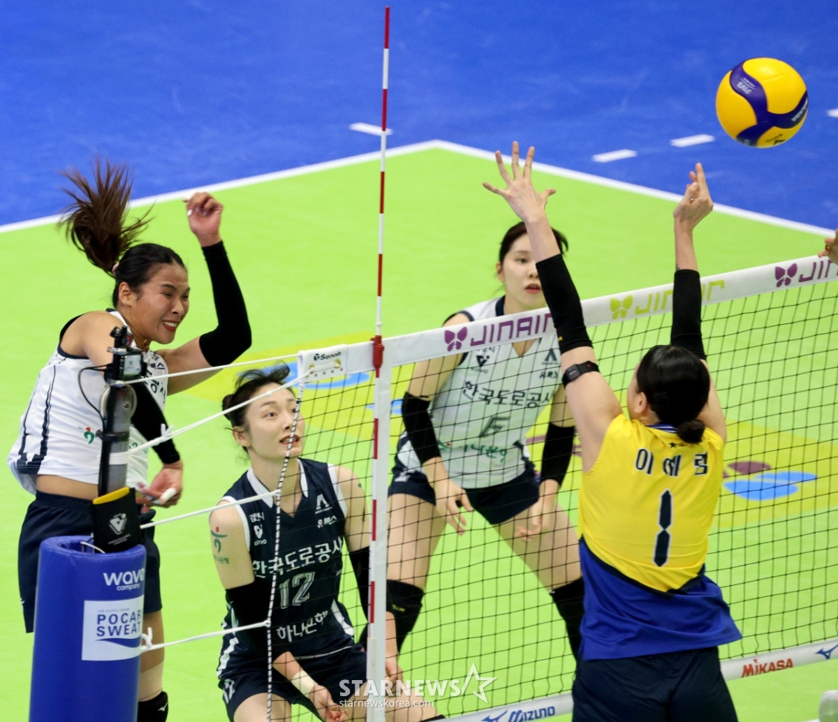 *此内容由AI翻译生成。13日,在水原体育馆举行的2025-2026真航空V联赛现代建设队和韩国道路公社队的比赛中,Doro Tanacha正在试图触网。 2026.02.13.© STARNEWS. 未经许可禁止转载或再分发*此内容由AI翻译生成。