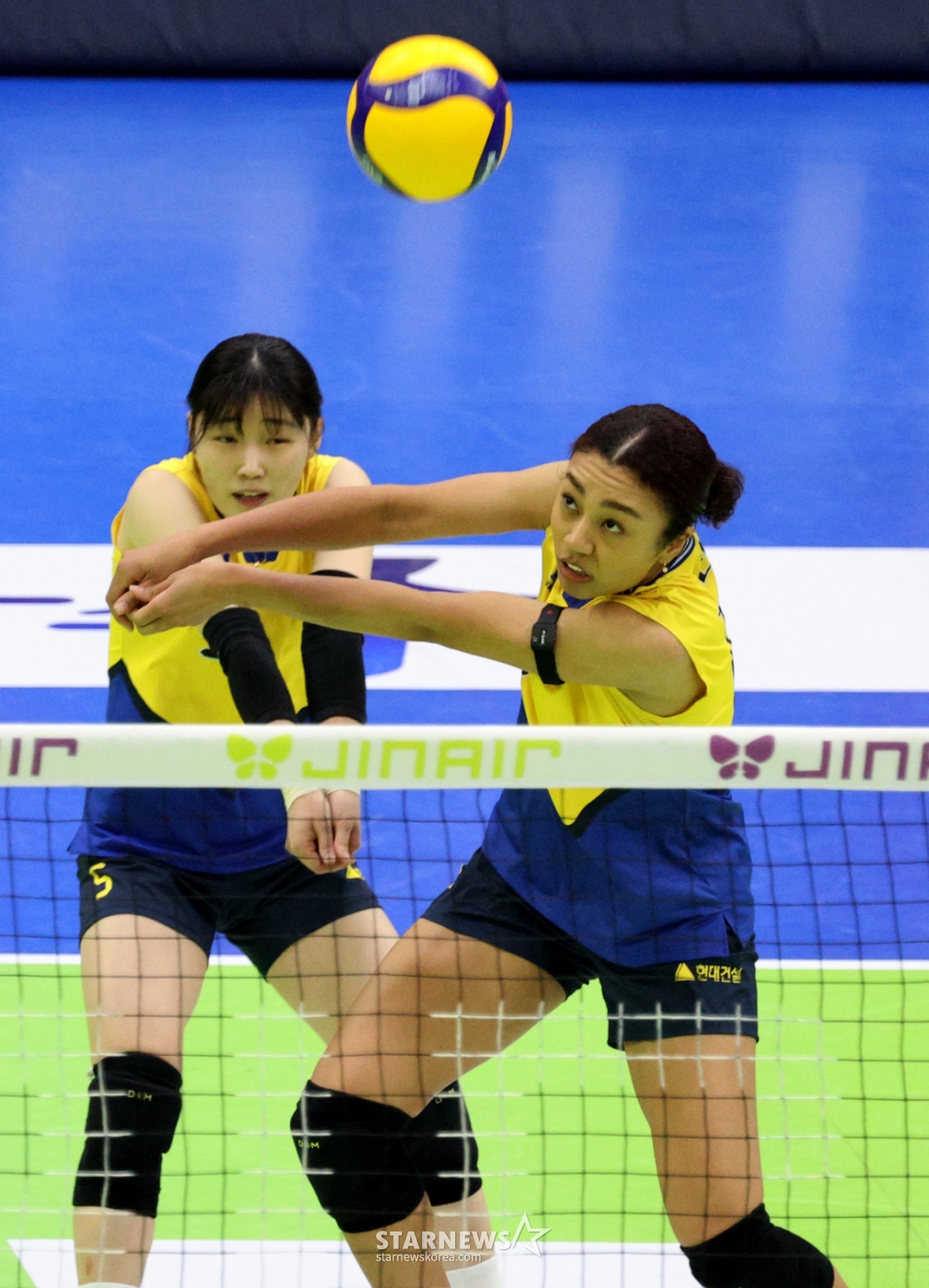 *此内容由AI翻译生成。13日,在水原体育馆举行的2025-2026真航空V联赛现代建设队和韩国道路公社队的比赛中,现代Jastice队领先李英珠(音)正在接发球。 2026.02.13.© STARNEWS. 未经许可禁止转载或再分发*此内容由AI翻译生成。