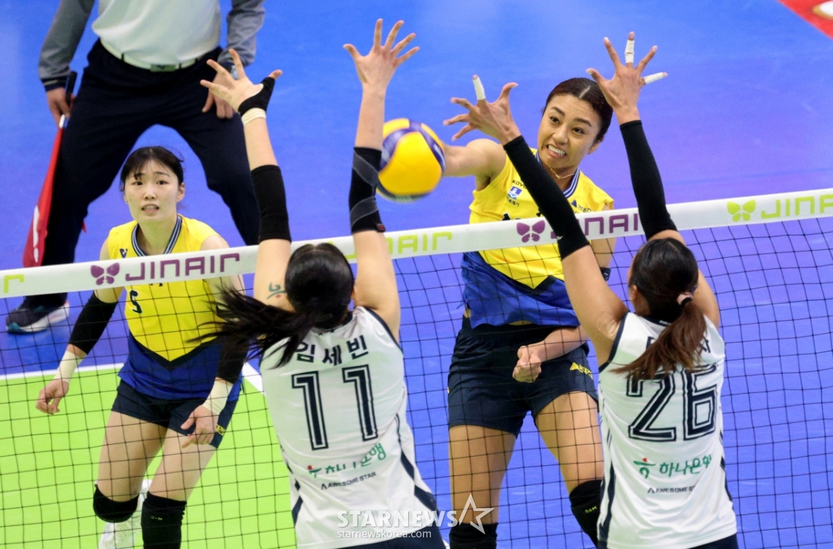 *此内容由AI翻译生成。13日,现代Jastice在水原体育馆举行的2025-2026真航空V联赛现代建设队和韩国道路公社队的比赛中,对道路公社队的双重拦网展开了猛烈的打击。 2026.02.13.© STARNEWS. 未经许可禁止转载或再分发*此内容由AI翻译生成。