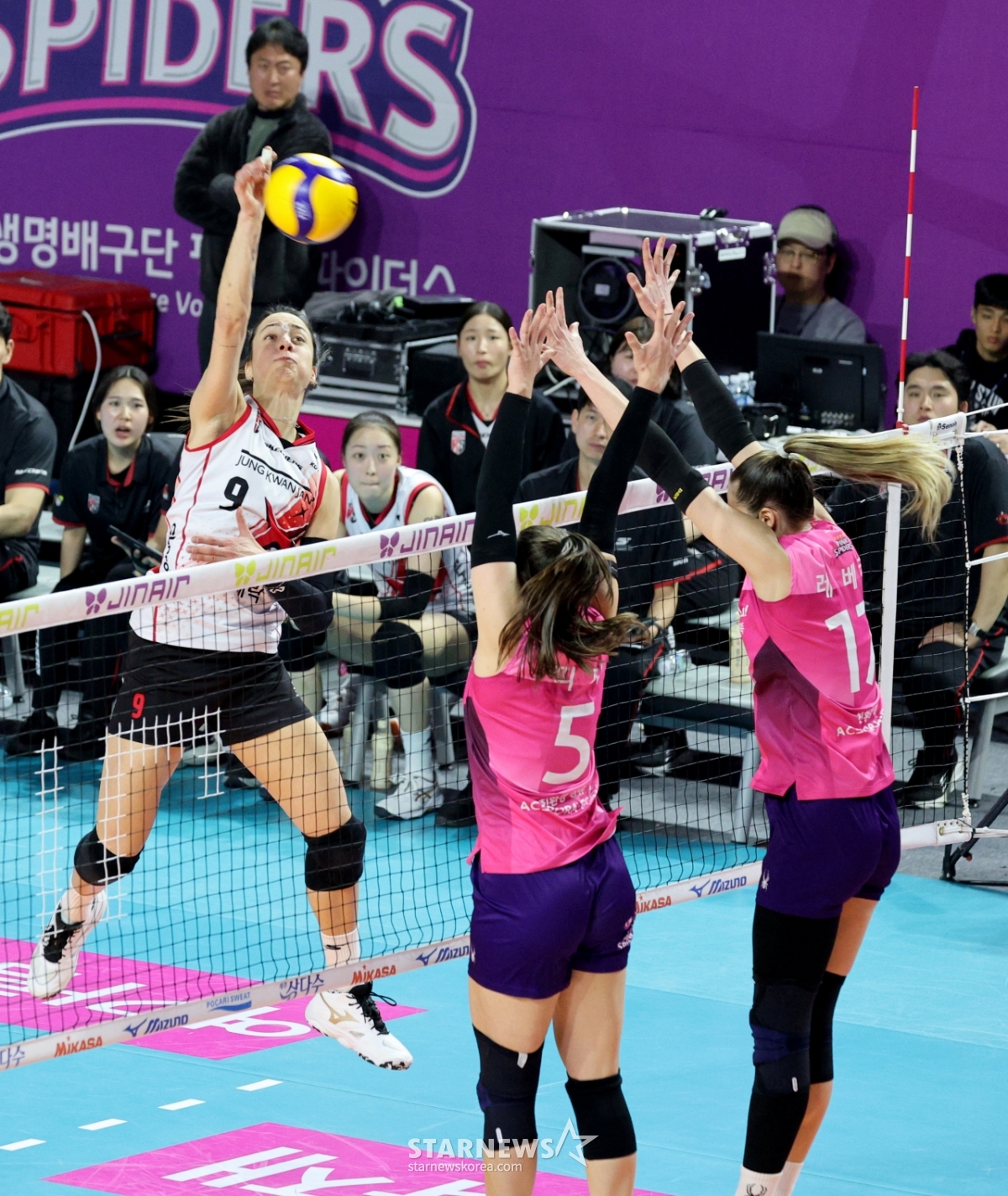 *此内容由AI翻译生成。正官庄Janete14日在三山世界体育馆举行的2025-2026真航空V联赛兴国生命和正官庄比赛中,对兴国双重拦网展开了猛烈的打击。 2026.02.14.© STARNEWS. 未经许可禁止转载或再分发*此内容由AI翻译生成。