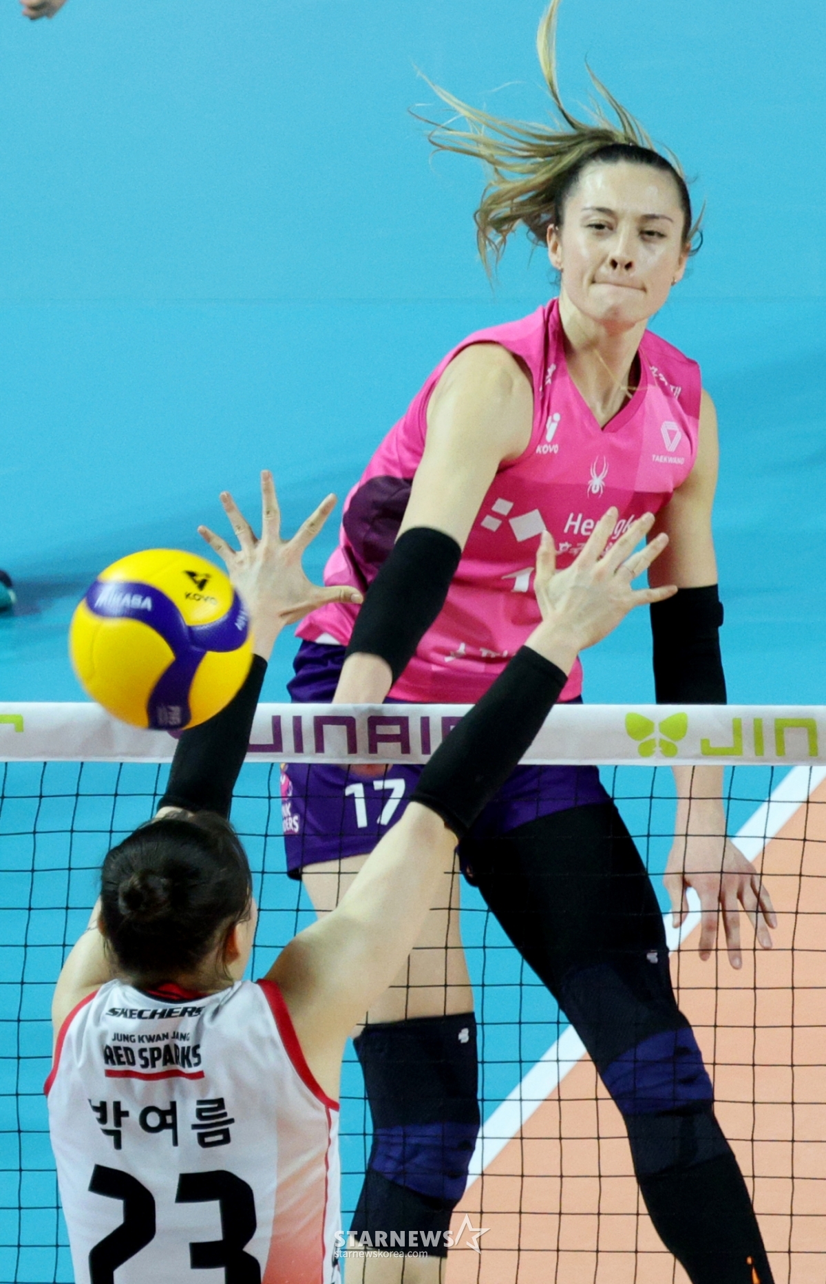 *此内容由AI翻译生成。14日,兴国生命丽贝卡在三山世界体育馆举行的2025-2026真航空V联赛兴国生命和正官庄比赛中,成功通过朴夏天拦网。 2026.02.14.© STARNEWS. 未经许可禁止转载或再分发*此内容由AI翻译生成。
