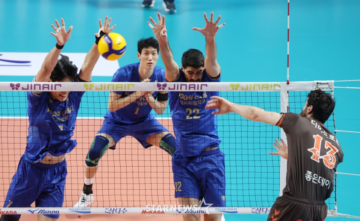 *此内容由AI翻译生成。15日,在首尔奖忠体育馆举行了2025-2026 V-联赛男子组友利信用卡对OK储蓄银行的比赛。OK储蓄银行Dimitrope正在友利信用卡的拦网上强力扣球。© STARNEWS. 未经许可禁止转载或再分发*此内容由AI翻译生成。