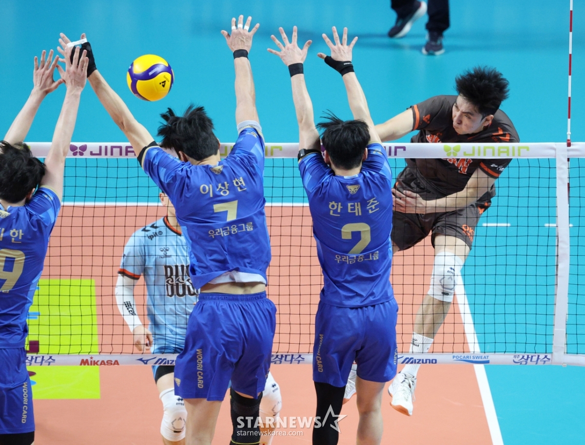 *此内容由AI翻译生成。15日,在首尔奖忠体育馆举行了2025-2026 V-联赛男子组友利信用卡对OK储蓄银行的比赛。OK储蓄银行车智焕正在友利信用卡三重拦网上强力扣球。© STARNEWS. 未经许可禁止转载或再分发*此内容由AI翻译生成。
