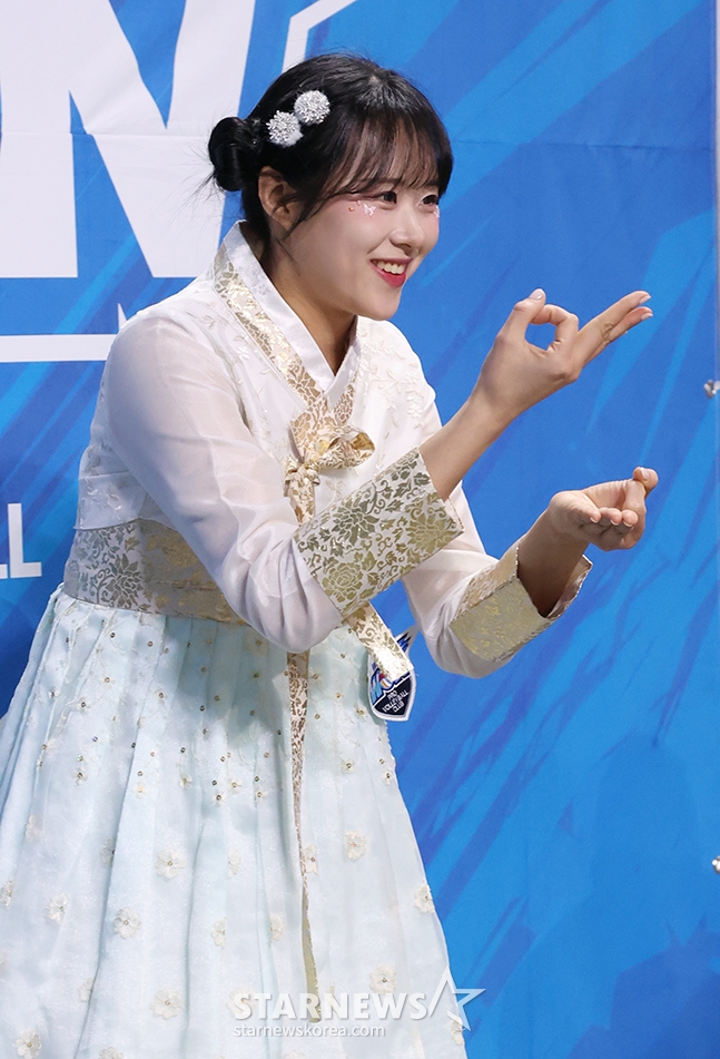 *此内容由AI翻译生成。15日,在首尔奖忠体育馆举行了2025-2026 V-联赛男子组友利信用卡对OK储蓄银行的比赛。友利信用卡的啦啦队队长李浩恩(音)身穿韩服为春节特辑加油助威。© STARNEWS. 未经许可禁止转载或再分发*此内容由AI翻译生成。