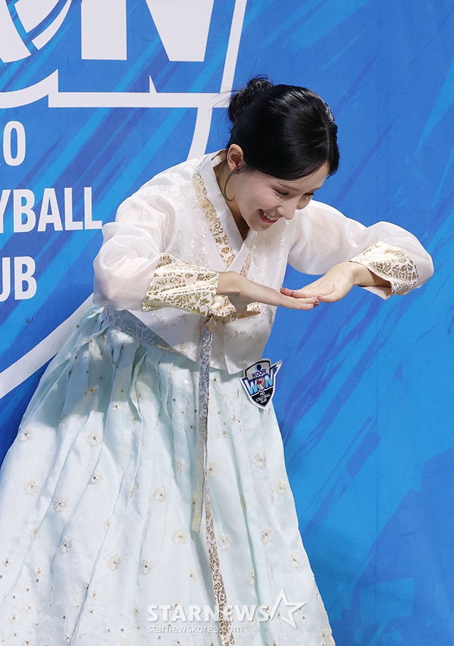 图为woori信用卡的啦啦队队员金妍儿(音)正身穿韩服为春节特辑加油助威。