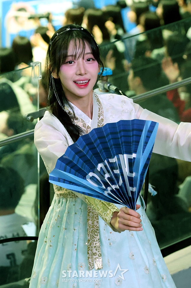 *此内容由AI翻译生成。15日,在首尔奖忠体育馆举行了2025-2026 V-联赛男子组友利信用卡对OK储蓄银行的比赛。图为woori信用卡的啦啦队队员正身穿优秀的韩服为春节特辑加油助威。© STARNEWS. 未经许可禁止转载或再分发*此内容由AI翻译生成。