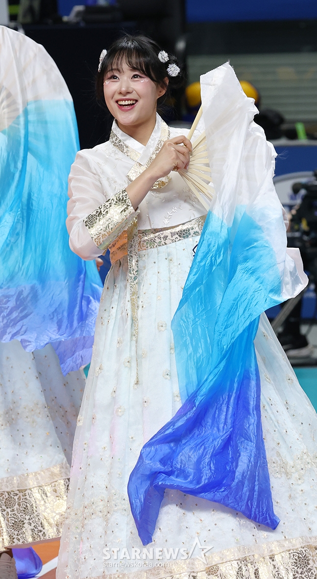 *此内容由AI翻译生成。15日,在首尔奖忠体育馆举行了2025-2026 V-联赛男子组友利信用卡对OK储蓄银行的比赛。友利信用卡的啦啦队队长李浩恩(音)身穿韩服为春节特辑加油助威。© STARNEWS. 未经许可禁止转载或再分发*此内容由AI翻译生成。