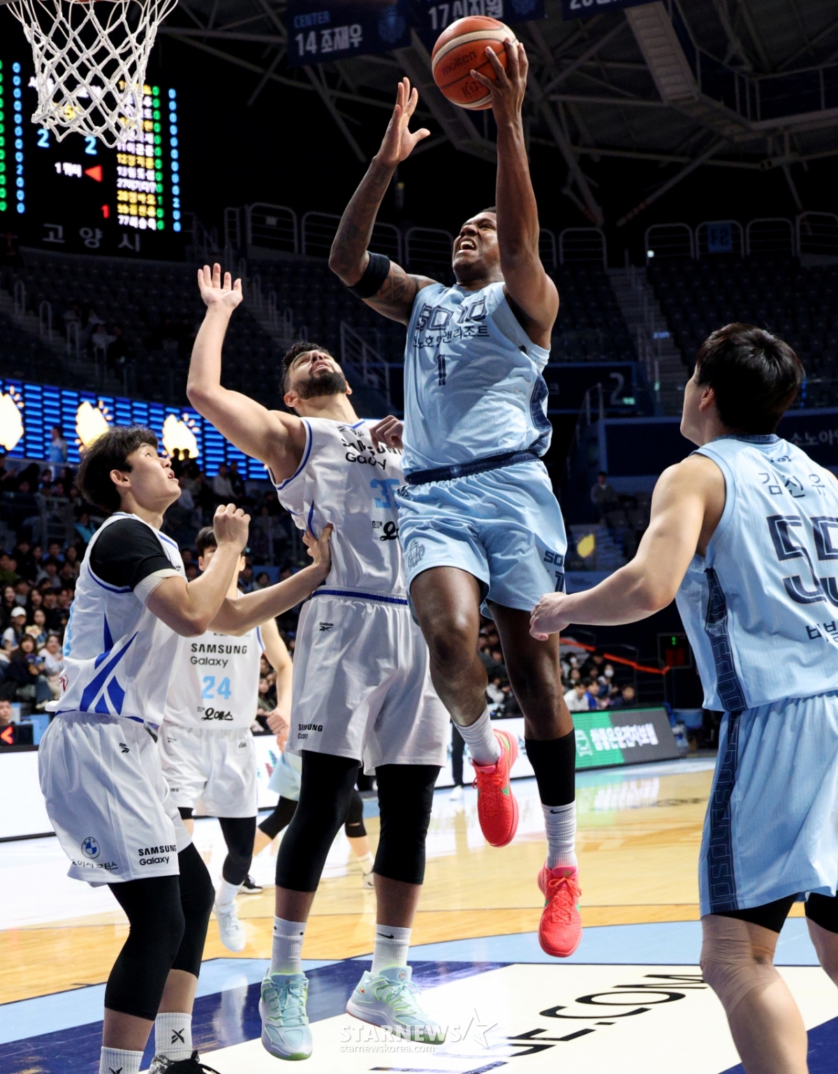 19日,高阳索诺骑士队在高阳索诺竞技场举行的2025-2026LG电子职业篮球高阳索诺队与首尔三星队的比赛中,正在接受三星康特的标记,试图投篮。 2026.02.19.